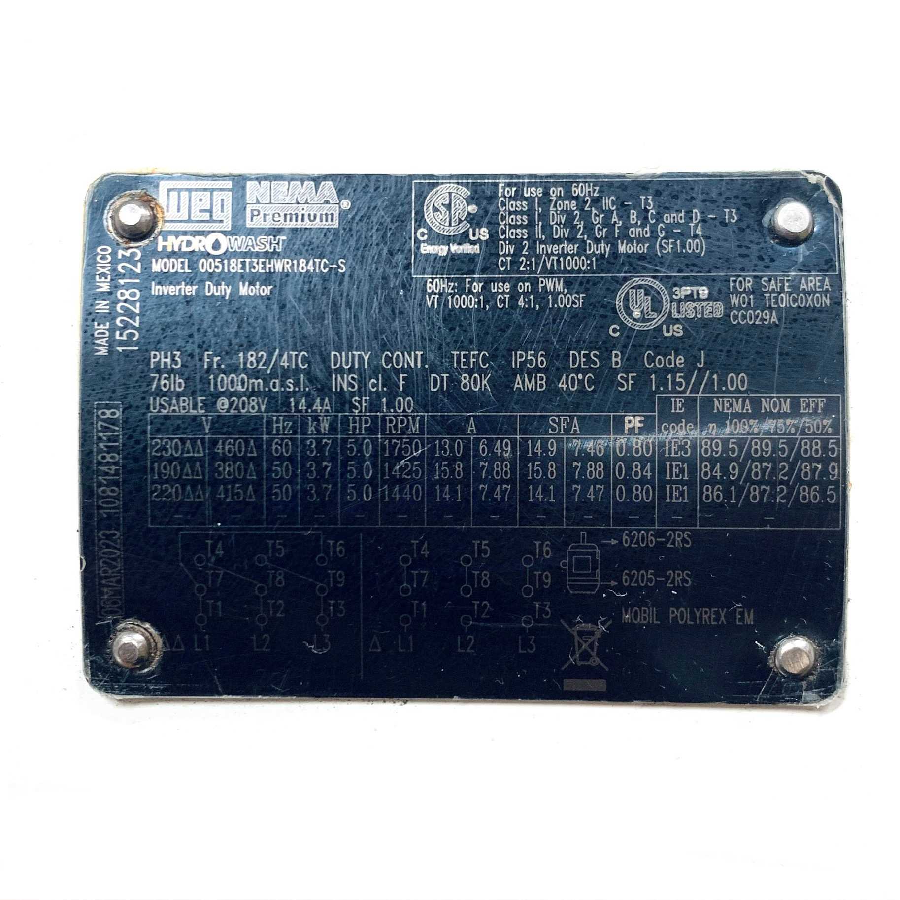 00518ET3EHWR184TC-S WEG 5HP Hydrowash Electric Motor, 1750RPM