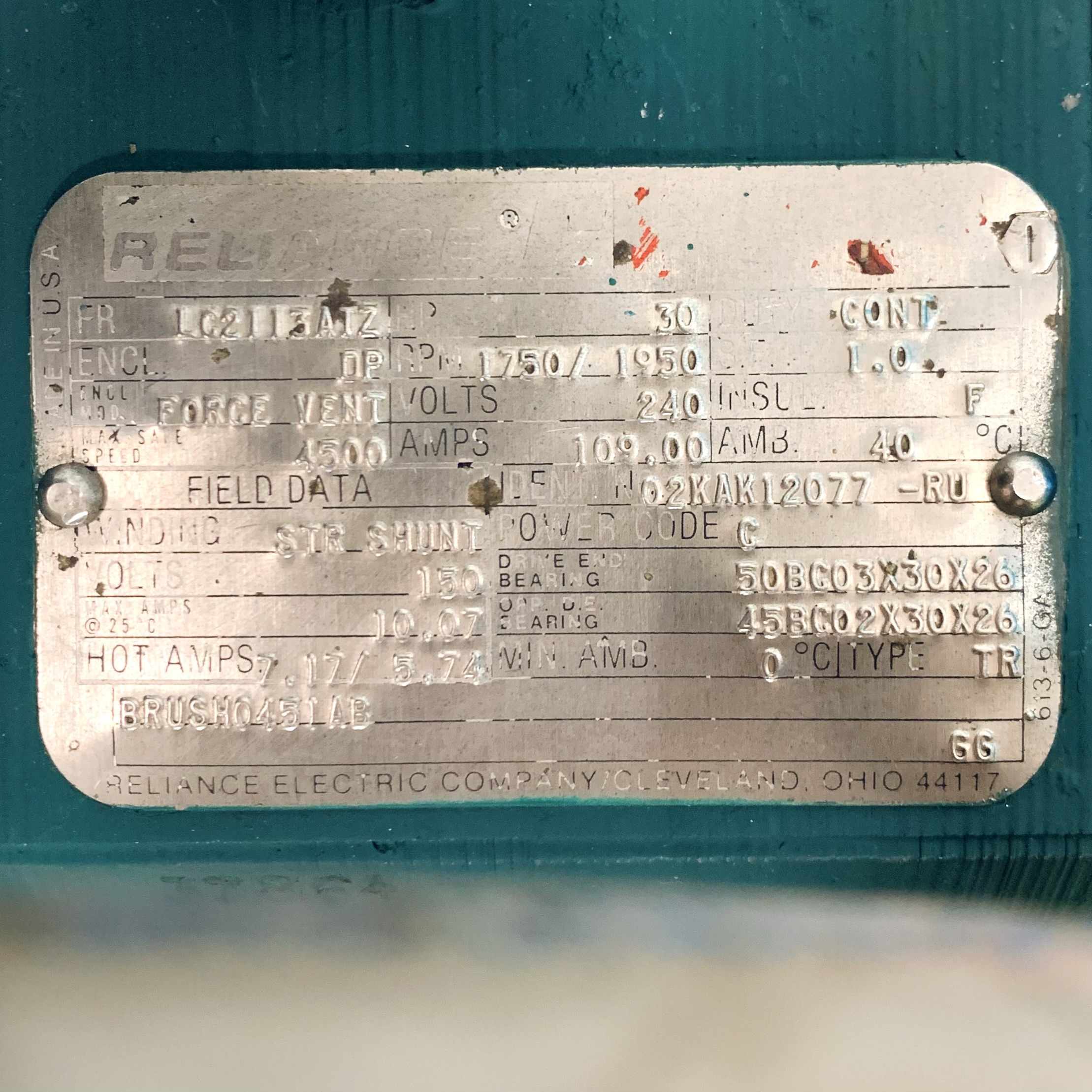 02KAK12077-RU 30HP Reliance D-C Motor, 1750/1950RPM, W/ A77B5901N-QU