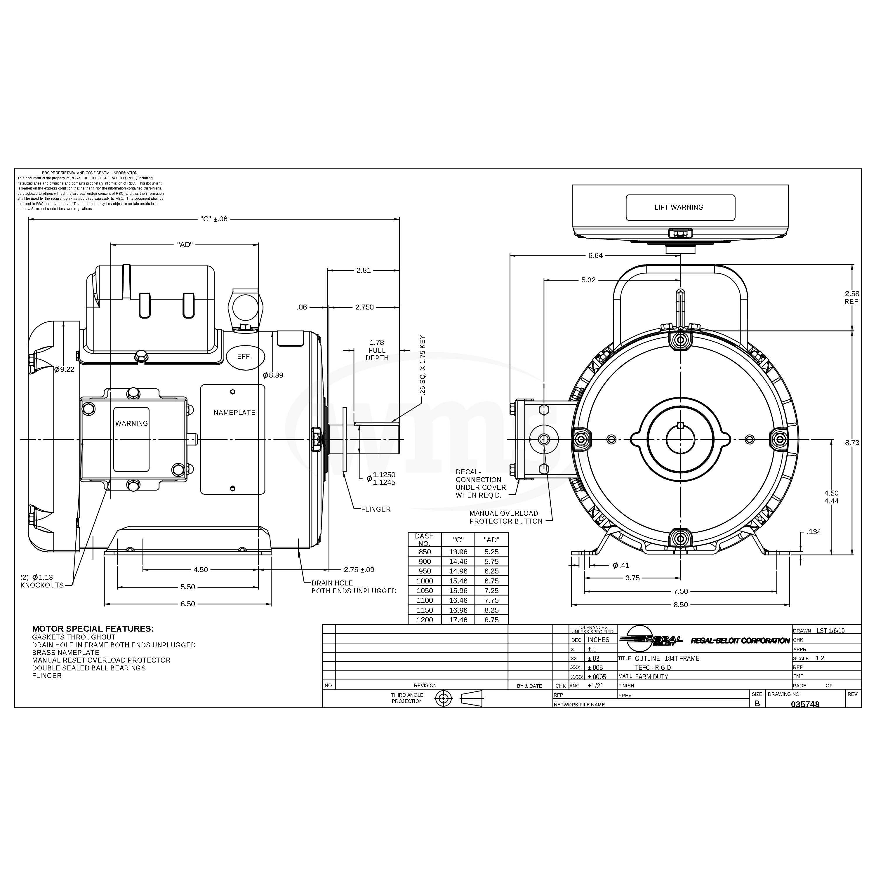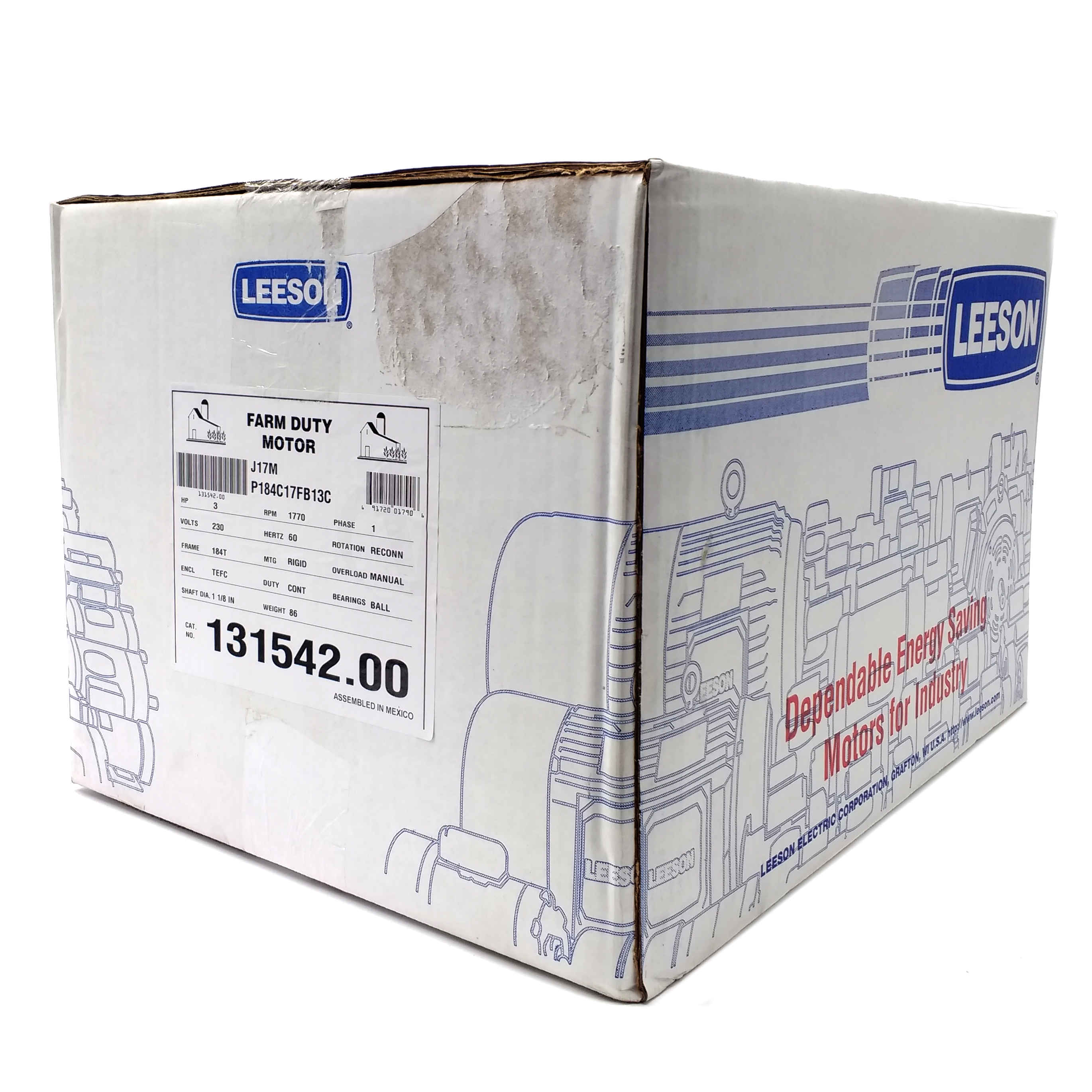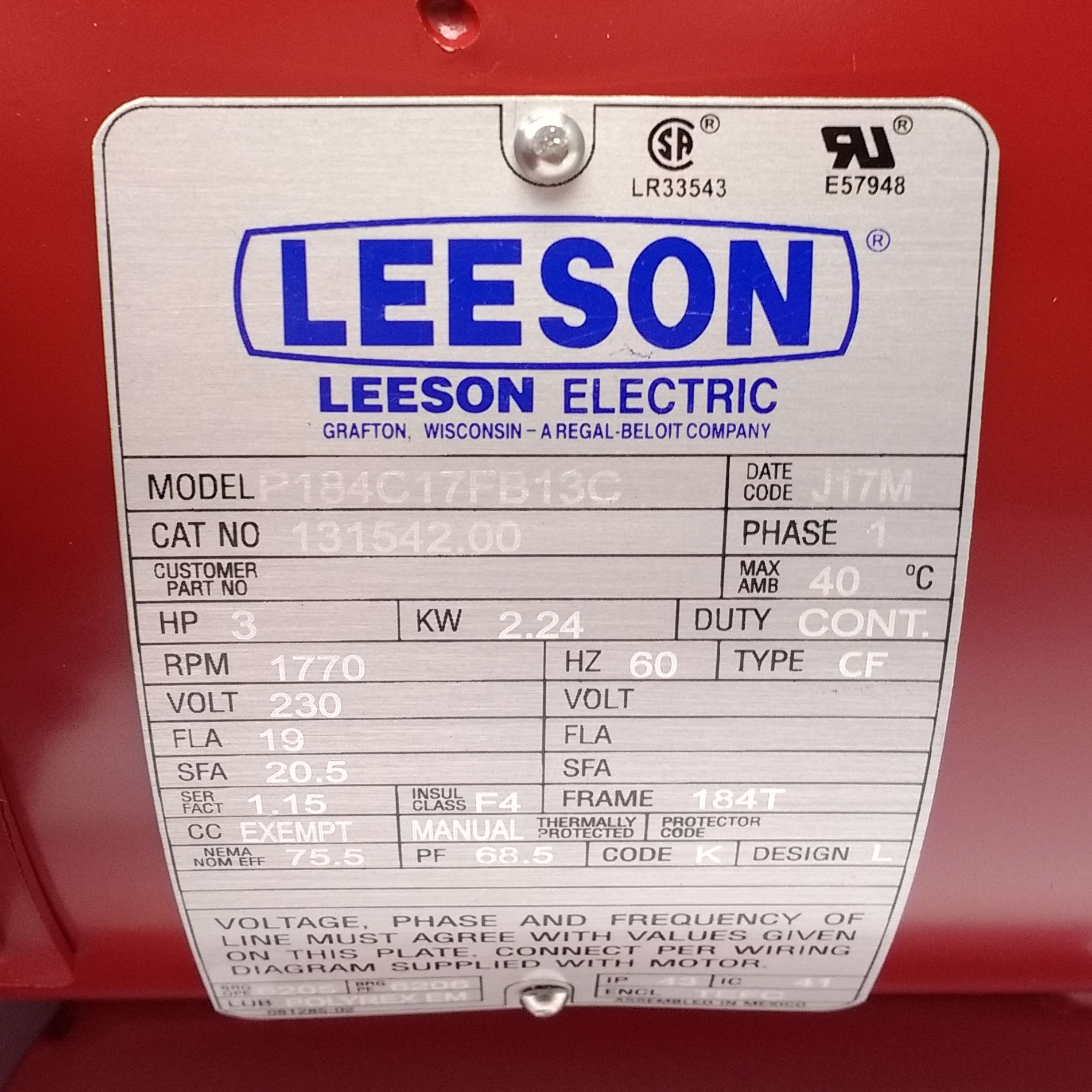 TEFC, 184T Frame, 230VAC Single Phase 60Hz, P184C17FB13C, Rigid Base, Rolled Steel, 1-1/8" Shaft