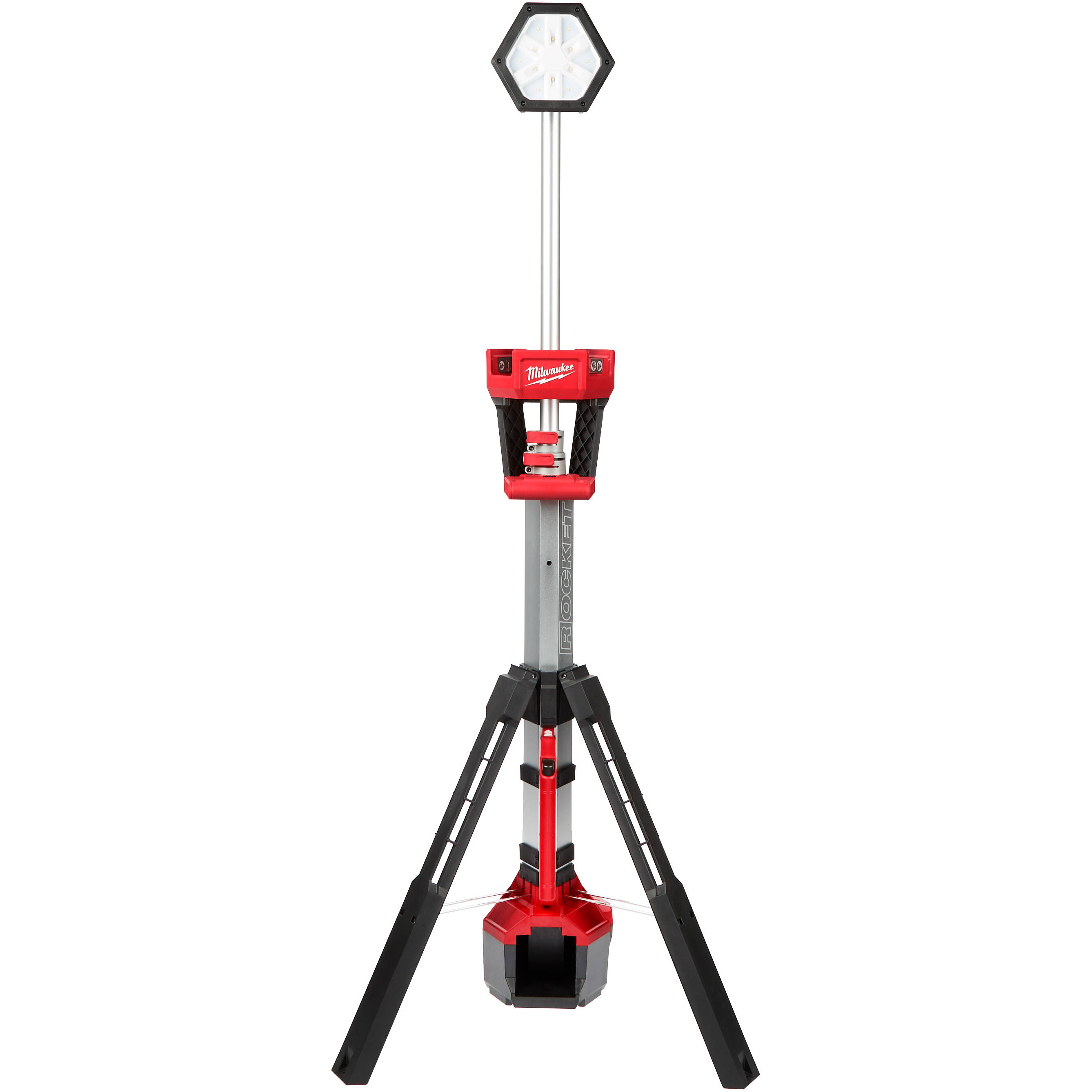Milwaukee's M18™ ROCKET™ Dual Power Tower Light provides 25% More Light and All Day Operation on the job site with 2500 lumens of TRUEVIEW™ High Definition Output. The LED light tower has Dual Power capability and can be powered by our M18™ batteries or by an extension cord. The tower light head can extend from 4 to 7 feet to light overhead work or minimize shadows when casting light downward. The LED light tower is capable of filling large areas with light and provides 2,500 lumens of TRUEVIEW™ High Definition Output in high mode, 1,100 in medium, and 700 in low. It can run for up to 13 hours with our M18™ REDLITHIUM™ XC 5.0 Battery Pack. MILWAUKEE® TRUEVIEW™ High Definition Output provides neutral white color and a high color rendering index with a reflector that produces an even beam pattern. The portable light tower has reinforced legs that are impact-resistant, and a low center of gravity provides a stable base. The LED light head is protected by an impact-resistant lens and bezel, nested in a protective shroud for secure transport and storage. The LEDs never need to be replaced and are backed by a limited lifetime warranty. The combination of these technologies offers professionals the highest quality LED lighting solutions, on or off the job site. MILWAUKEE® ROCKET™ Tower Lights are designed to deploy in seconds and built to adapt to any job site environment. The LED light towers supply both task and area lighting as well as provide light overhead to reduce shadows in the workspace.