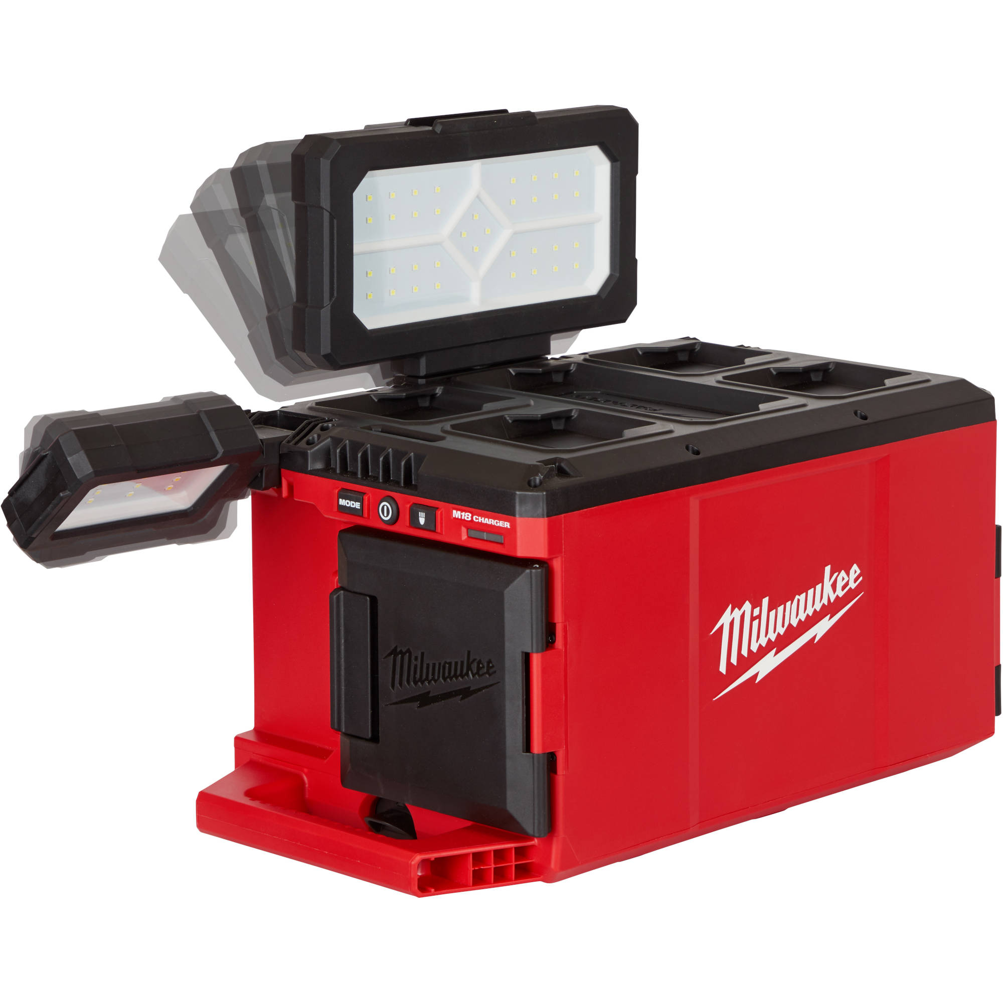 Milwaukee's M18™ PACKOUT™ Light/Charger provides you with all day multi-directional lighting and charging. This portable light delivers 3000 Lumens of TRUEVIEW™ High Definition Output and is fully compatible with the PACKOUT™ Modular Storage System. Three independent rotating light heads allow for complete control over lighting direction whether you're using it on your PACKOUT™ stack or as a dedicated light off the stack. You can manage output and runtime on this portable work light with three different modes (All Lights, Main Panel, or Back/Front Lights), each including high, medium, and low settings for up to 31 hours of runtime with one M18™ REDLITHIUM™ XC 5.0 Battery. There is an AC input for all day runtime and M18™ Battery charging. This MILWAUKEE® PACKOUT Light allows you to charge devices with the 2.1AMP USB output and store small items inside the storage compartment.