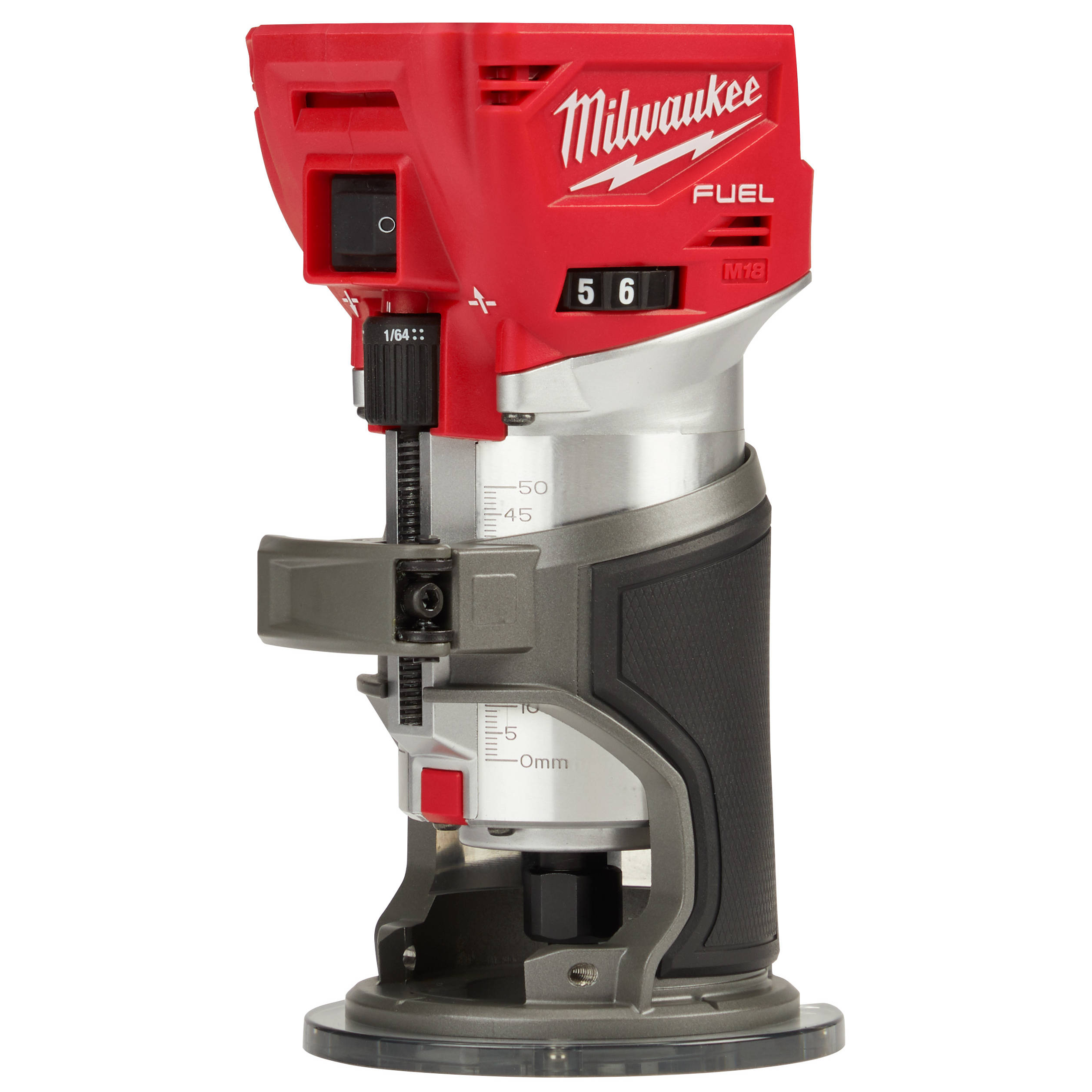 Our M18 FUEL™ Compact Router combines power, speed and accurate depth adjustments to deliver clean accurate cuts in a variety of materials and applications. The compact router leverages our POWERSTATE™ Brushless Motor and REDLINK PLUS™ electronics. This delivers the power of corded 1.25 horsepower trim routers and best-in-class 31,000 RPM providing you with power and speed for clean, quality cuts in hard materials. With our M18™ REDLITHIUM™ XC5.0 battery, the cordless compact router cuts up to 250ft of 3/8" roundovers in red-oak, providing you with all-day run time with fewer trips to the charger. The handheld router is equipped with a micro-adjust dial and macro-adjust button, providing you with fast and accurate depth adjustments for highly accurate work. A variable-speed dial with speed from 10,000 to 31,000 RPM gives you control in all applications. The compact router also features a sturdy 4" sub-base plate providing you with stability, and dual-LED lights illuminate your work surface. The M18 FUEL™ Compact Router is compatible with a plunge base and an offset base (sold separately).