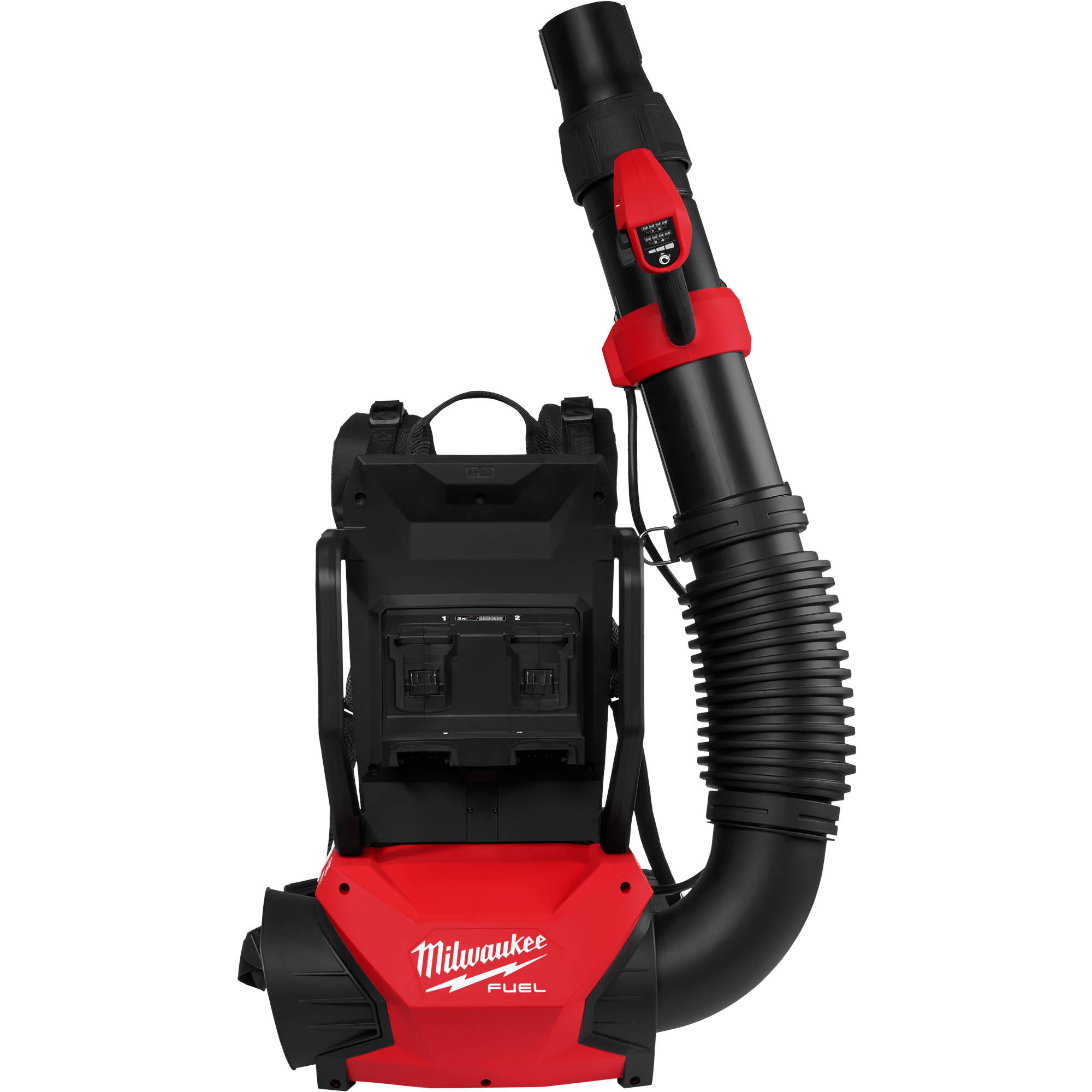The M18 FUEL™ Dual Battery Backpack Blower is designed for the professional, delivering a higher blowing force than a 60cc gas powered blower. The backpack blower reaches full throttle of 650 CFM and 155 MPH in under one second, boosting productivity and control. The blower requires at least (2) M18™ REDLITHIUM™ Batteries for operation, while providing (2) additional batteries terminals to extend runtime. This battery set-up allows the operator to adjust the number of batteries for either lighter weight in quicker clean ups or more runtime in extended clearing applications. This adjustable battery configuration combined with a fully adjustable harness, mode select, telescoping nozzle, variable speed trigger, and low noise level of just 62dB(A) allow the blower adapt to all the operator's needs when using.