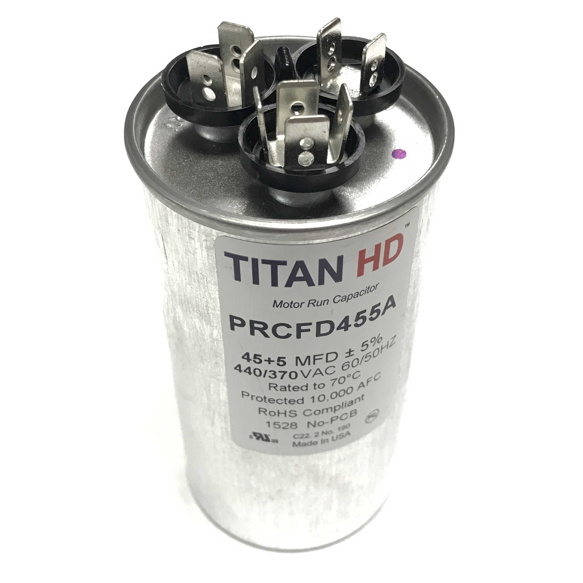 PRCFD455A 45+5 MFD Titan HD Run Capacitor440/370 Vac, 50-60 Hz.Available Stock: 8MFG: Packard, Inc.PRCFD455A $21.02 / Each Details...