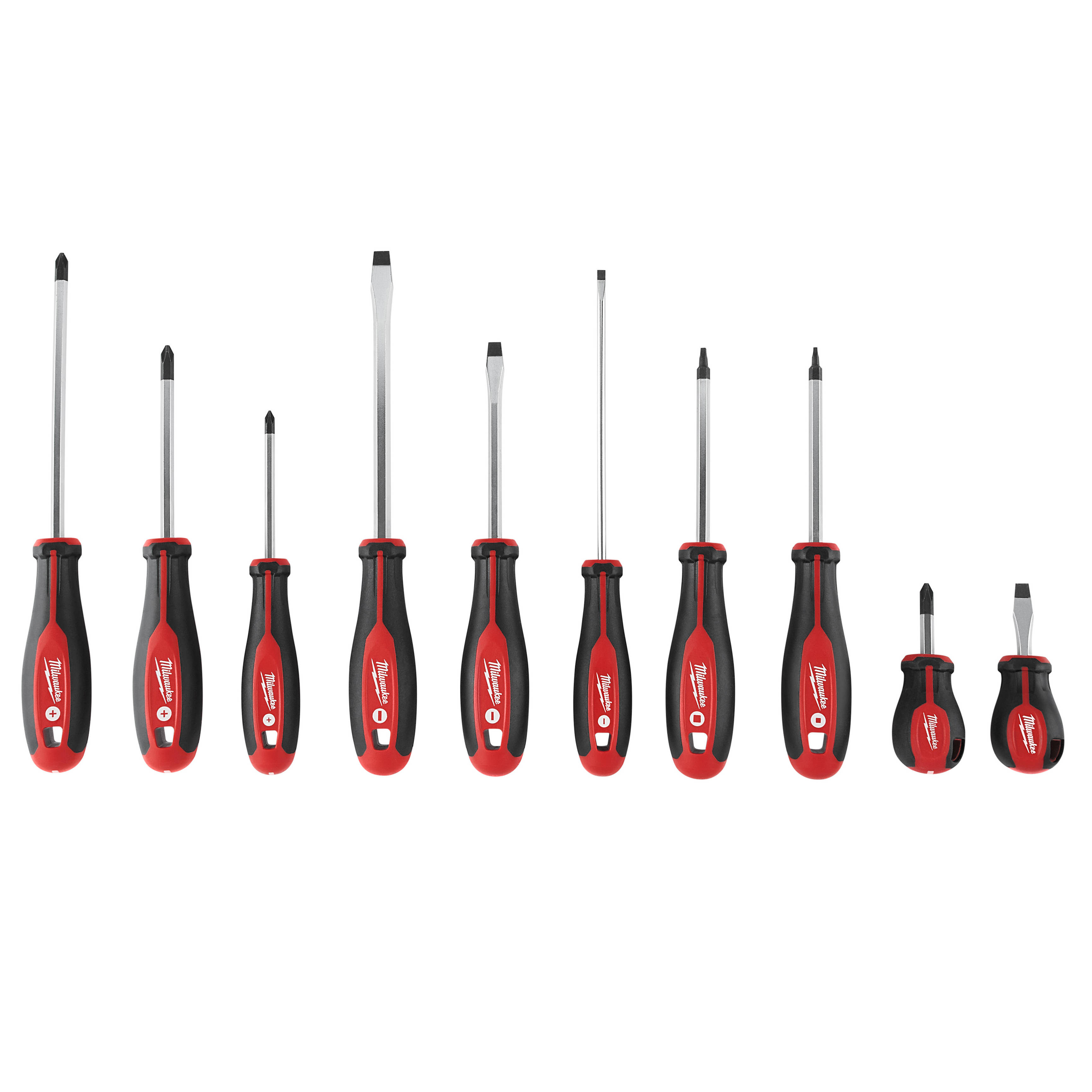 Featuring hardened tips & forged shanks the Milwaukee® 10 Piece Screwdriver Set provides professional grade solutions and durability to the user. Bit types are marked on the cap of each tool for quick identification and increased efficiency.The comfortable tri-lobe handle allows users to comfortably apply more leverage.