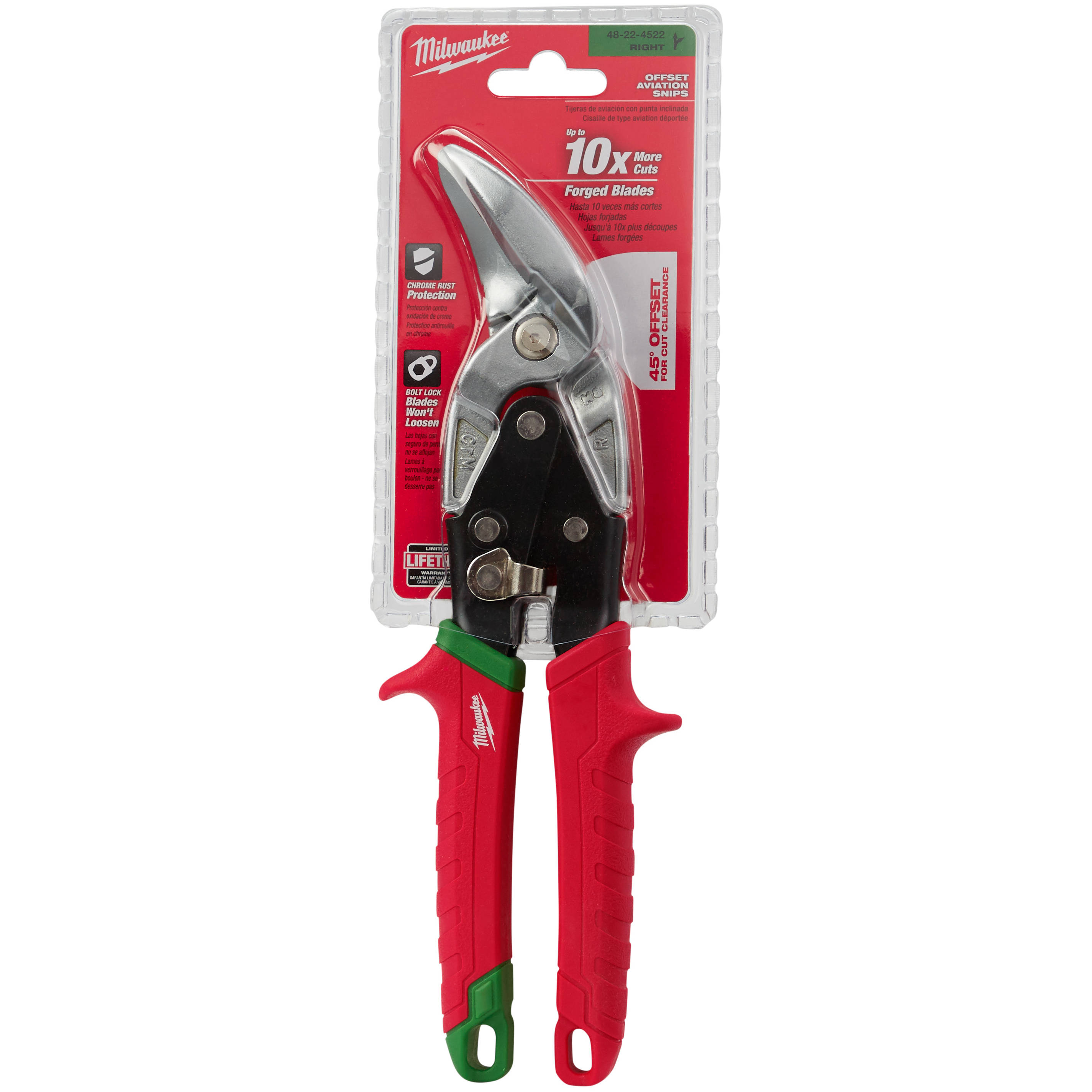 Milwaukee® Aviation Snips are built for long life and durability. Forged blades deliver up to 10X more cuts than cast blades. Bolt Lock ensures the blades won't loosen and chrome plating provides rust protection. The flush pivot bolt won't hang up on material for easy use. The metal lock secures the tool for storage and is easily operated with one hand. The offset model features a 45 degree offset handle for clearance over the cut material. Ideal for right or straight cuts.