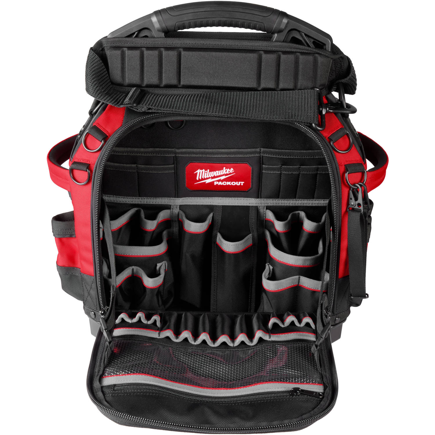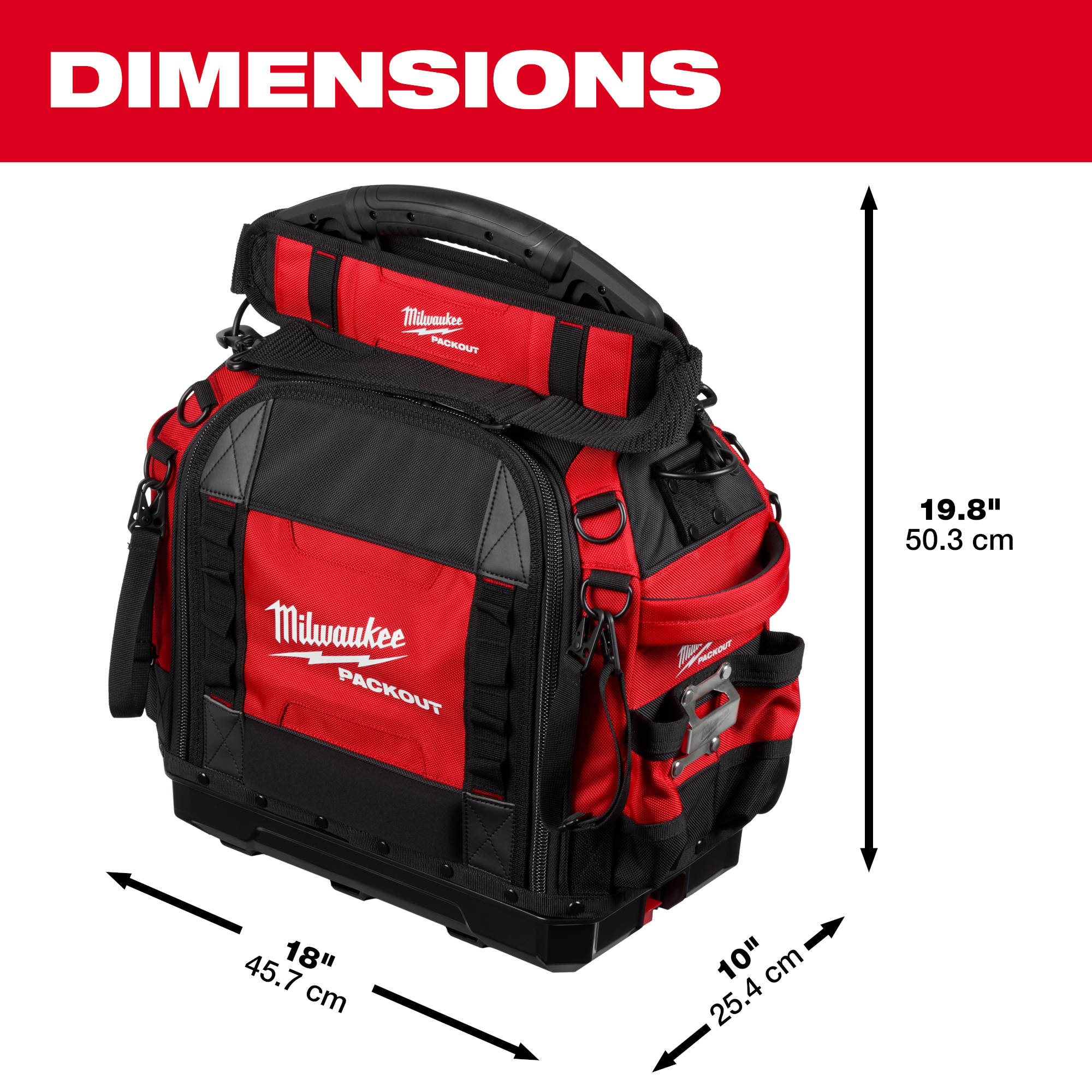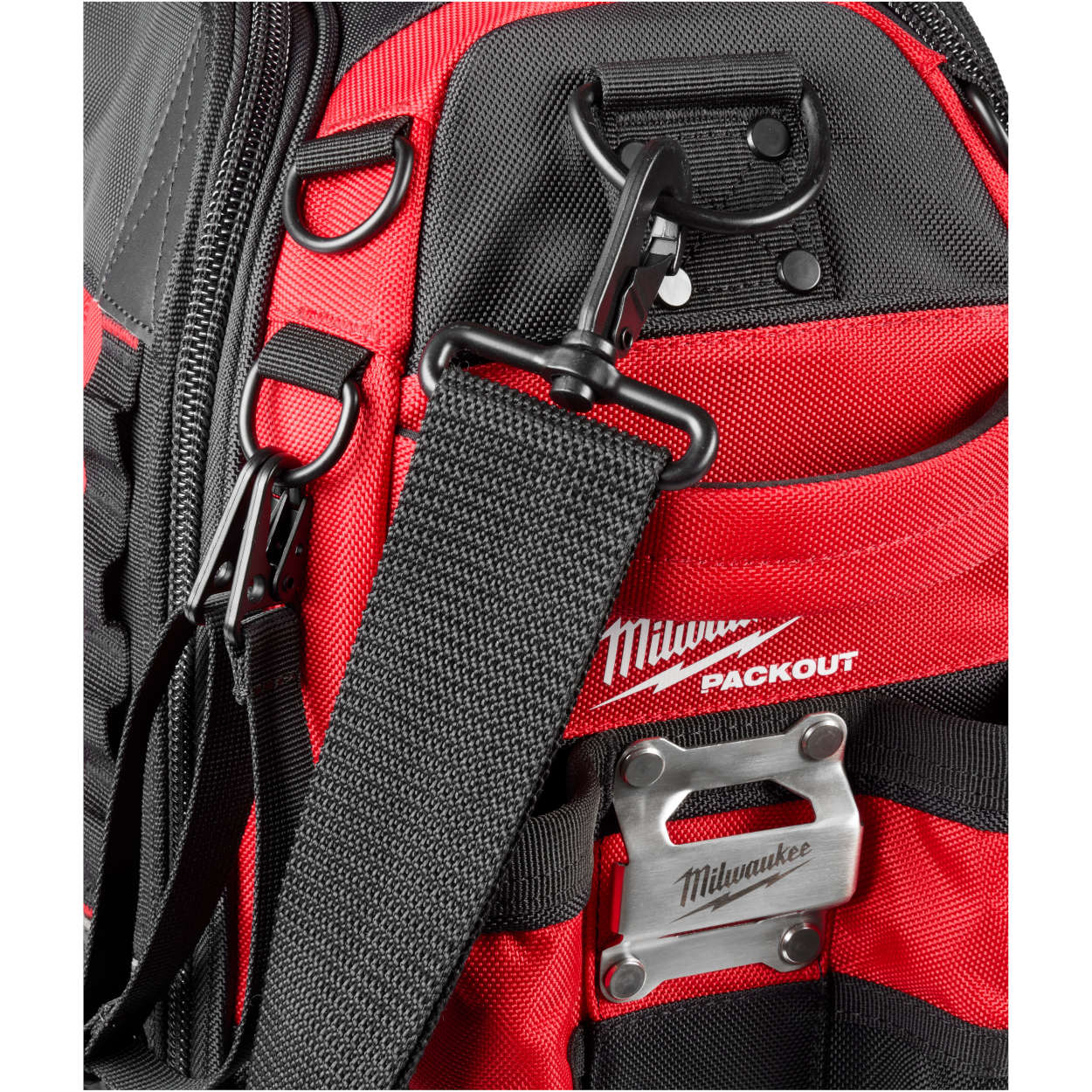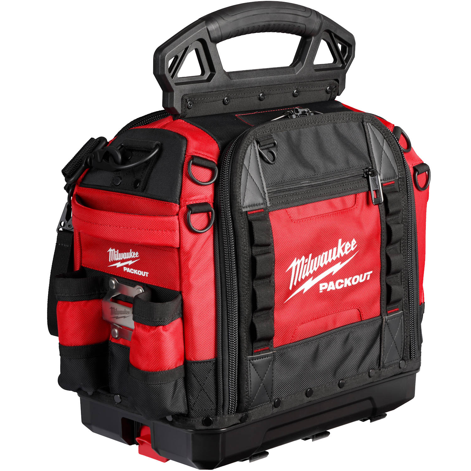 The Milwaukee PACKOUT™ Modular Storage System is part of the industry's most durable and versatile storage system. The PACKOUT™ 15” Structured Tool Bag features tear resistant layered ballistic material, a reinforced structure that holds its shape over time, and has a carrying capacity of up to 50 pounds. The impact-resistant molded base connects with other MILWAUKEE® PACKOUT™ system components via integrated locking cleats. Milwaukee's 15” Structured Tool Bag has all metal hardware, YKK zippers, and includes 65 pockets. The padded shoulder strap quickly and conveniently stores on the handle for maximum organization. The Milwaukee PACKOUT™ Modular Storage System allows you to customize and build your storage system to easily transport and organize your tools and accessories.
