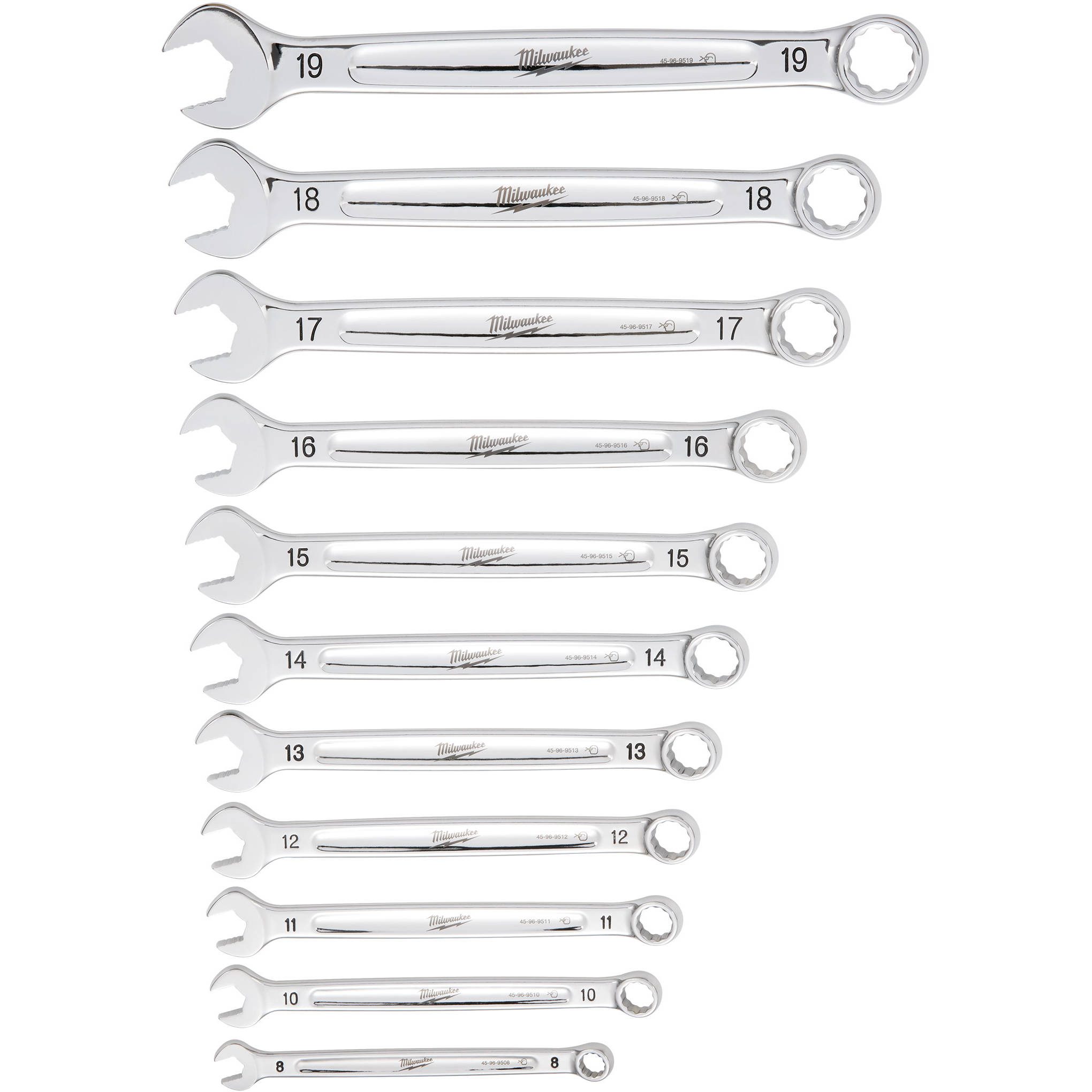 The MILWAUKEE® 11 Piece Metric Combination Wrench Set delivers maximum torque and ultimate user comfort. Milwaukee's MAX BITE™ Open-End Grip improves the wrench's grip on nuts and bolts, and the geometry reduces rounding and stripping. MAX BITE™ offers 25% More Torque than competitive wrench designs. The Comfortable I-Beam Handle Design allows superior user comfort, even while applying high torque. Milwaukee's combo wrench sets feature Ink-Filled Size Labels for easy size identification and the quick distinction between SAE and metric sets. The 11 piece wrench sets come in a storage tray designed for Long-Term Storage, keeping your tool chest organized. Milwaukee offers a Lifetime Guarantee on all their Combination Wrench Sets.