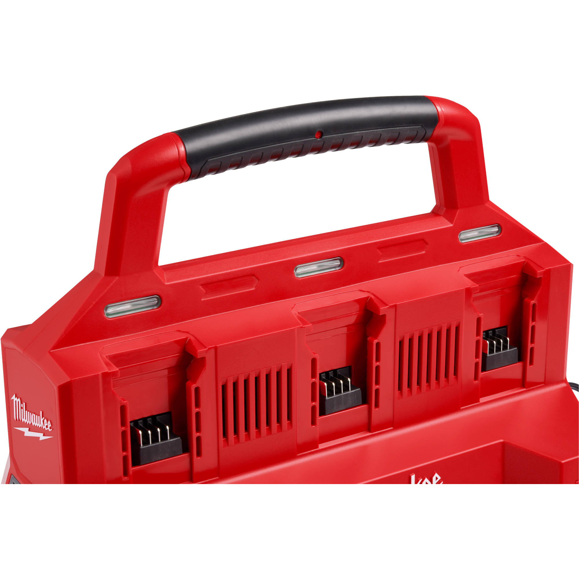 The Milwaukee M18™ PACKOUT™ Six Bay RAPID Charger is the first dedicated charging solution compatible with the MILWAUKEE® PACKOUT™ modular storage system. This Six Bay RAPID Charger charges two batteries simultaneously at a RAPID charge rate, up to 40% faster than other Milwaukee Tool standard rate chargers. Manage six batteries and consolidate your charging experience. Spend less time swapping batteries on the jobsite. This battery charger is optimized for transportation and storage on and off the jobsite. Integrate this charger into your PACKOUT™ modular storage system, and experience unmatched charging portability. Bring this charger with you, either on your PACKOUT™ stack, or by utilizing the convenient carrying handle. The Milwaukee M18™ PACKOUT™ Six Bay RAPID Charger includes (1) USB-A port, allowing users to charge small personal electronics such as phones, tablets, and headlights. During charging, store your personal electronics on either side of the charger with storage caddies. The M18™ PACKOUT™ Six Bay RAPID Charger provides users with REDUCED DOWNTIME, & UNMATCHED PORTABILITY.