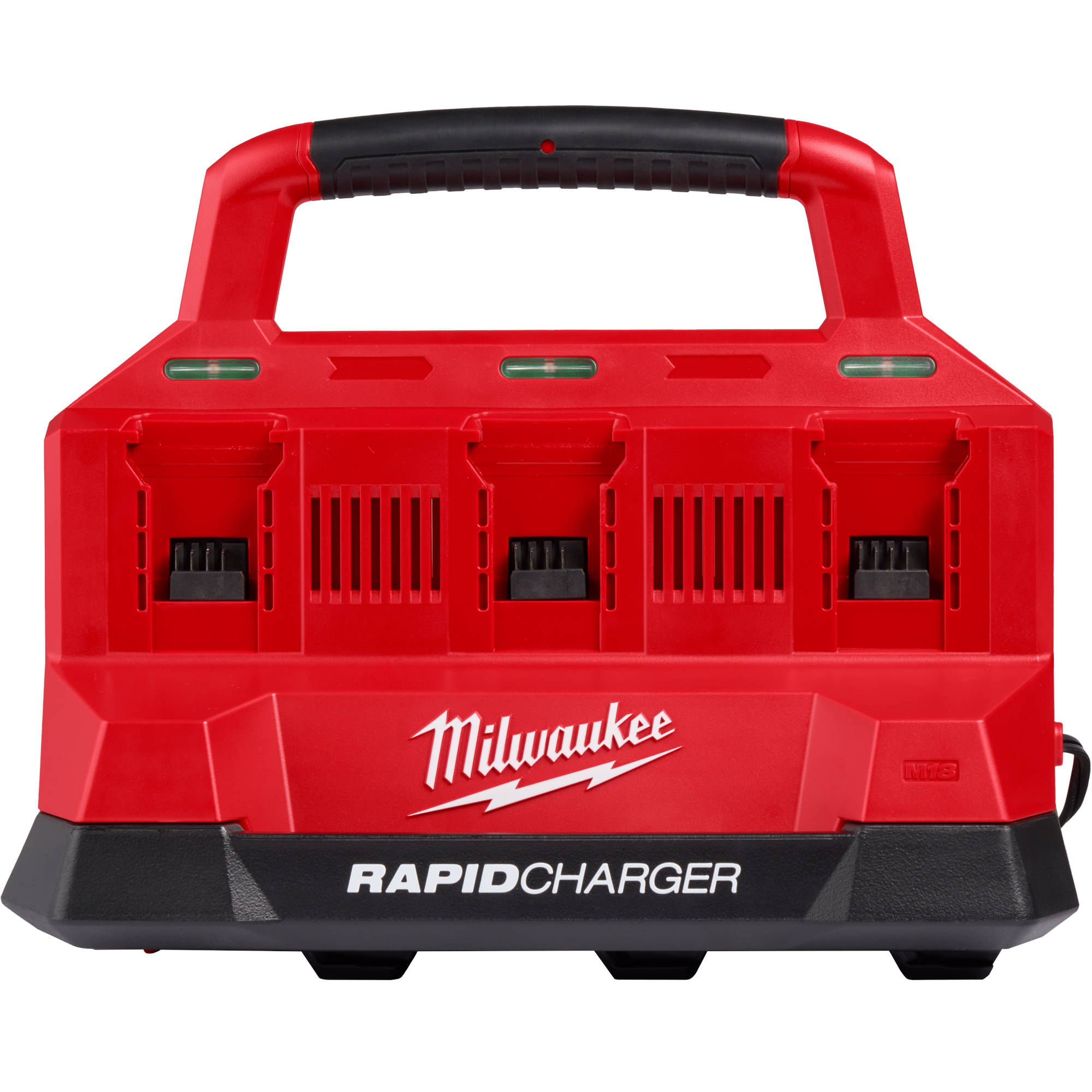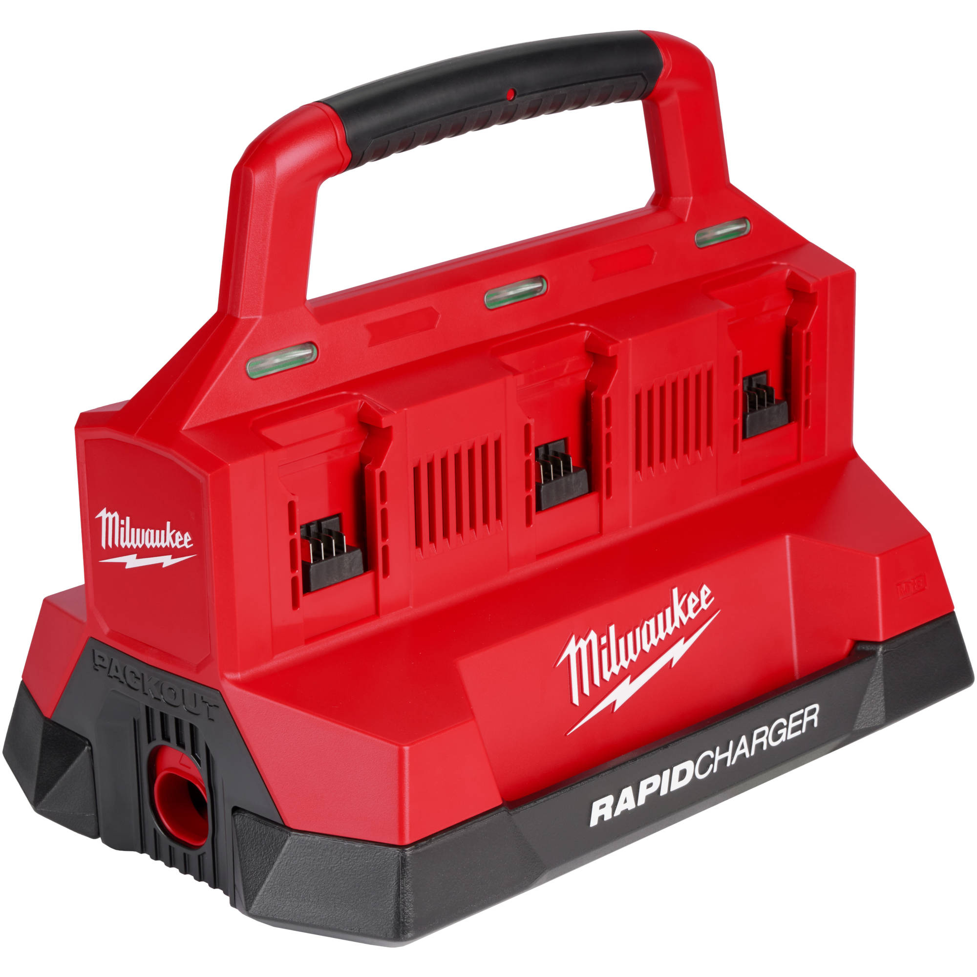 The Milwaukee M18™ PACKOUT™ Six Bay RAPID Charger is the first dedicated charging solution compatible with the MILWAUKEE® PACKOUT™ modular storage system. This Six Bay RAPID Charger charges two batteries simultaneously at a RAPID charge rate, up to 40% faster than other Milwaukee Tool standard rate chargers. Manage six batteries and consolidate your charging experience. Spend less time swapping batteries on the jobsite. This battery charger is optimized for transportation and storage on and off the jobsite. Integrate this charger into your PACKOUT™ modular storage system, and experience unmatched charging portability. Bring this charger with you, either on your PACKOUT™ stack, or by utilizing the convenient carrying handle. The Milwaukee M18™ PACKOUT™ Six Bay RAPID Charger includes (1) USB-A port, allowing users to charge small personal electronics such as phones, tablets, and headlights. During charging, store your personal electronics on either side of the charger with storage caddies. The M18™ PACKOUT™ Six Bay RAPID Charger provides users with REDUCED DOWNTIME, & UNMATCHED PORTABILITY.