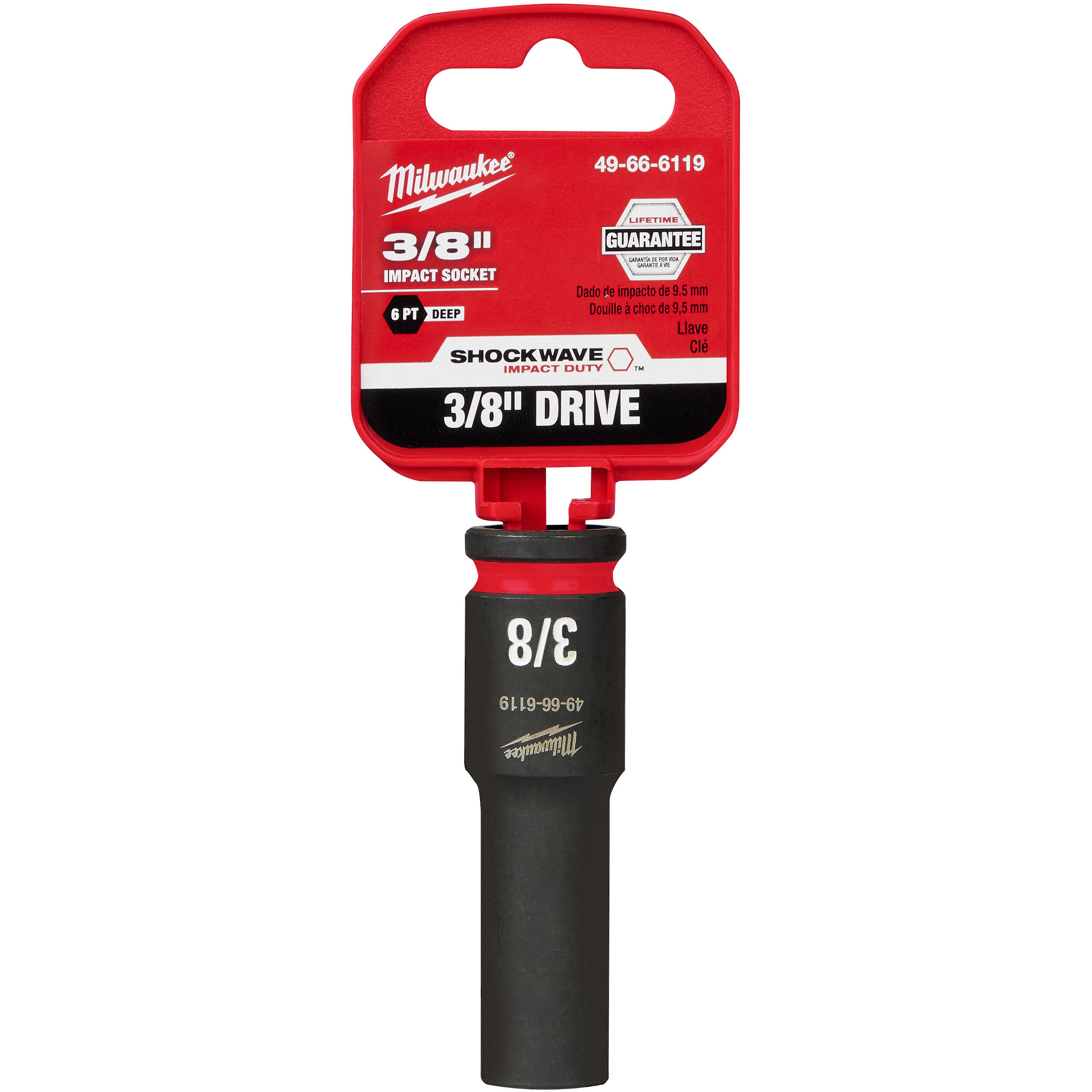 The Milwaukee SHOCKWAVE Impact Duty? 3/8" Drive 6 Point Sockets feature the boldest, longest-lasting markings and extreme impact durability in high torque applications. The stamped and ink-filled size markings enable you to select the right socket every time throughout the life of the socket. Milwaukee engineered these 6-point standard sockets with high-strength forged steel for optimized performance in heavy-duty applications, and a non-slip hex geometry prevents fastener rounding. The dual-hole design and ring groove allow for easy socket attachment and removal. All MILWAUKEE? SHOCKWAVE Impact Duty? Sockets are backed by Milwaukee's Lifetime Guarantee and meet ASME industry standards.