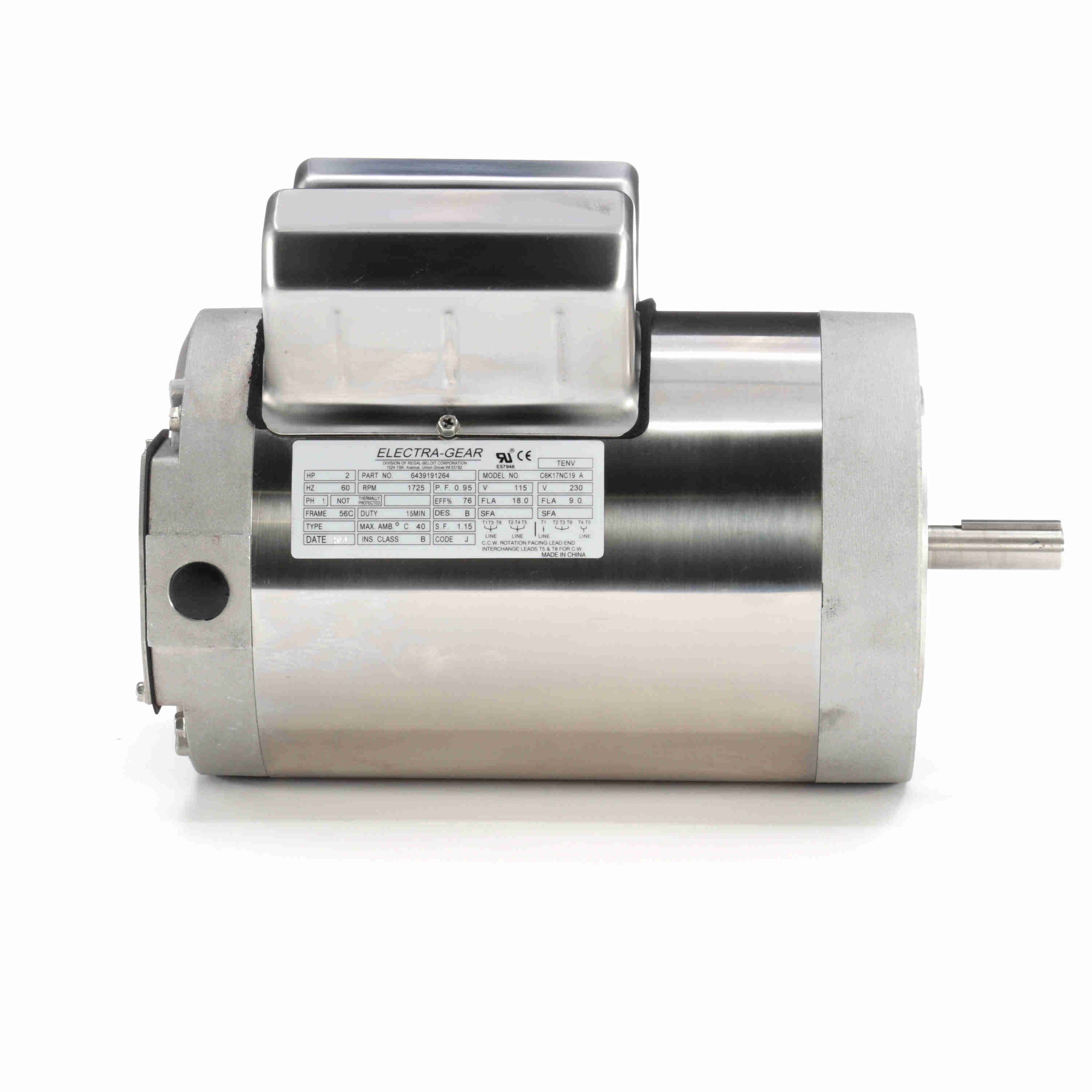 Part Description :2HP..1800RPM.56C.TENV.115/230V.1PH.60HZ.15 MIN.NOT.40C.1.15SF.C-FACE.BOAT HOIST. Category :Boat Hoist Duty