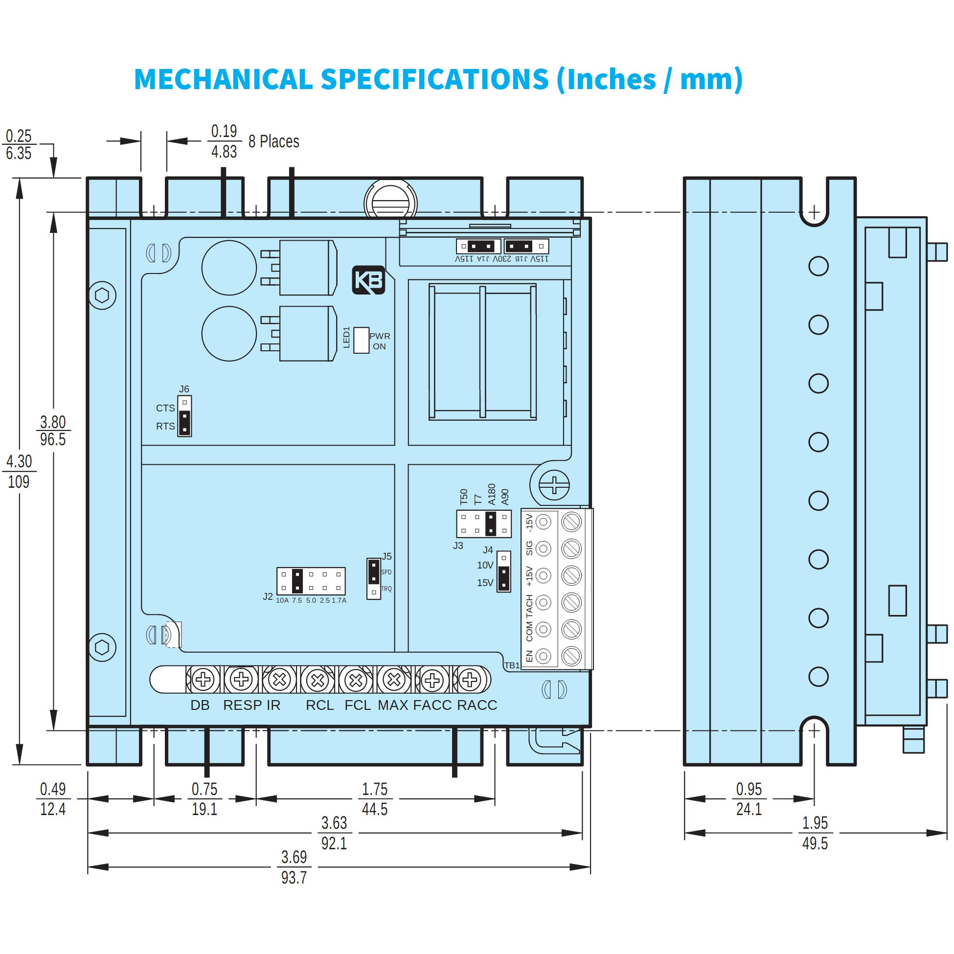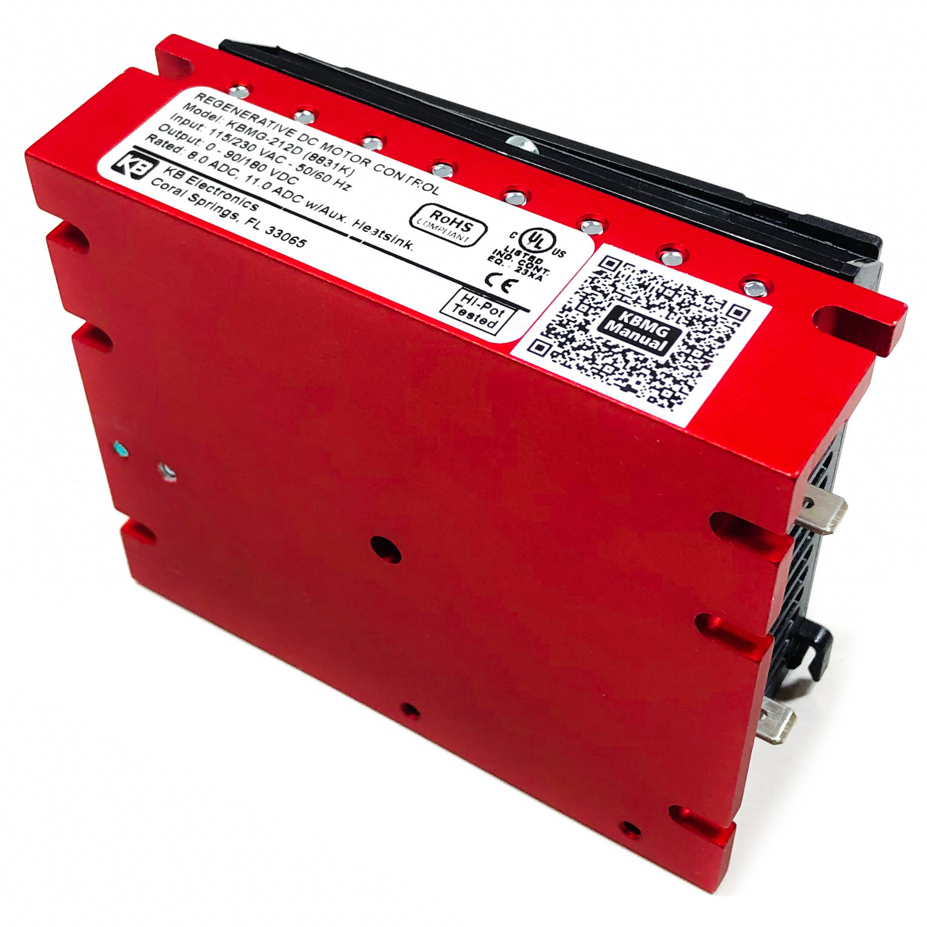 KB’s exclusive Auto Inhibit® circuit provides safe, smooth starting even during rapid cycling of the AC line. The Overspeed Protect Circuit prevents failure of the power bridge in extreme overhauling conditions. Reliability of the KBMG is further enhanced with the use of a high speed current limit circuit and MOV transient protection. LED’s, which can be used for diagnostics, are provided for power on and motor overload. A rugged extruded aluminum heat sink ensures enhanced heat transfer, which provides a higher control rating while maintaining cooler running SCR’s. The KBMG contains a finger-safe cover to meet the IP-20 Standard.