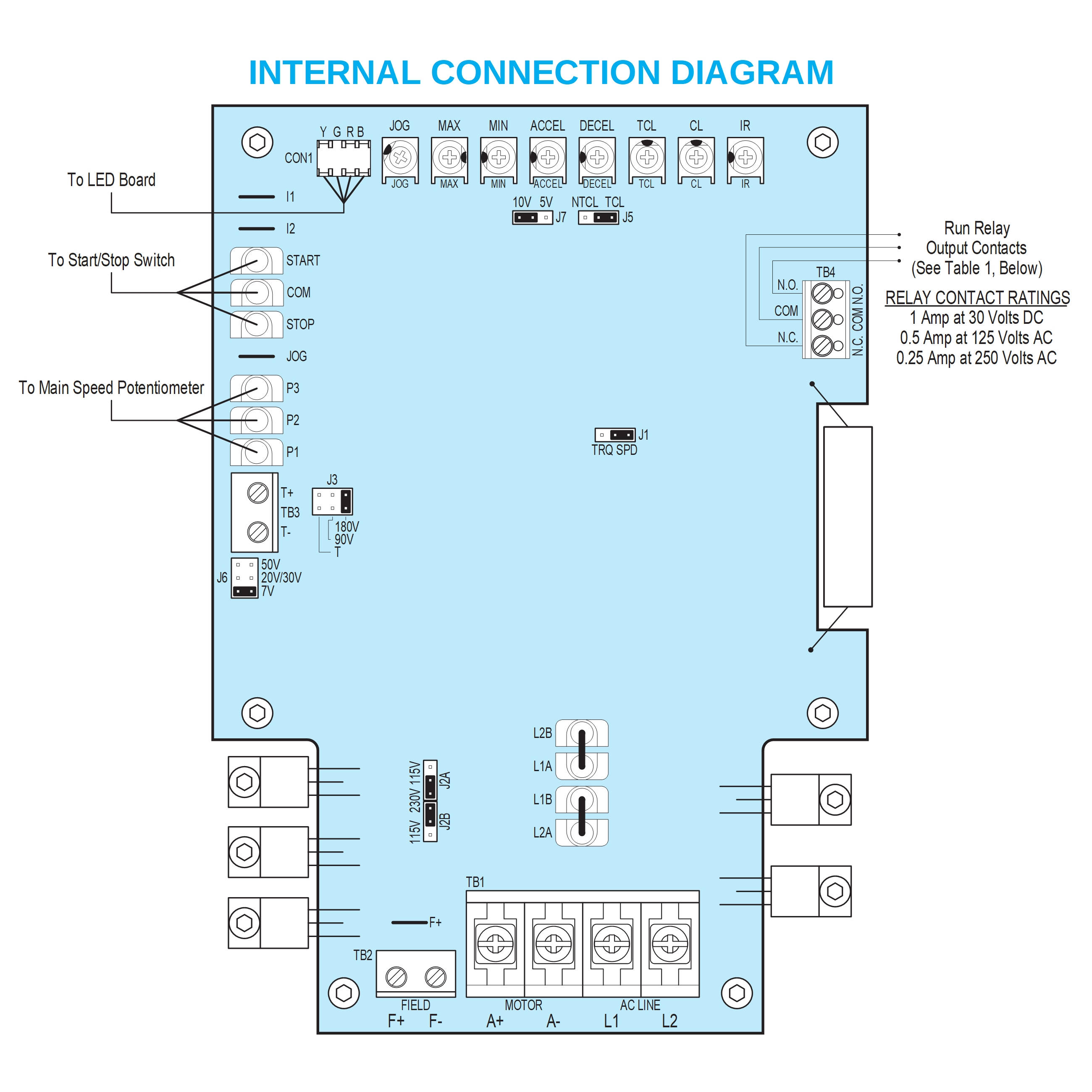The KBPC state-of-the-art electronics include short circuit and transient protection to provide the ultimate in reliability. Electronics overload protection is also provided which prevents motor burnout and demagnetization of PM motors. The control can be operated in either the speed or torque mode via a jumper selection. The current range, which is also jumper selectable, eliminates the necessity for calibration of IR compensation and current limit for most applications. The KBPC also contains jumper selections for AC line voltage (230/115), DC armature voltage (180/90) and feedback type (armature/tachometer).