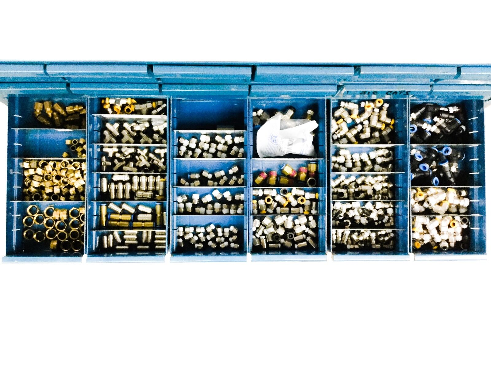 Comes with the used bin and each part is barcoded by Fastenal, Also 4 Drawers of miscellaneous fittings. Over $4000.00 value.