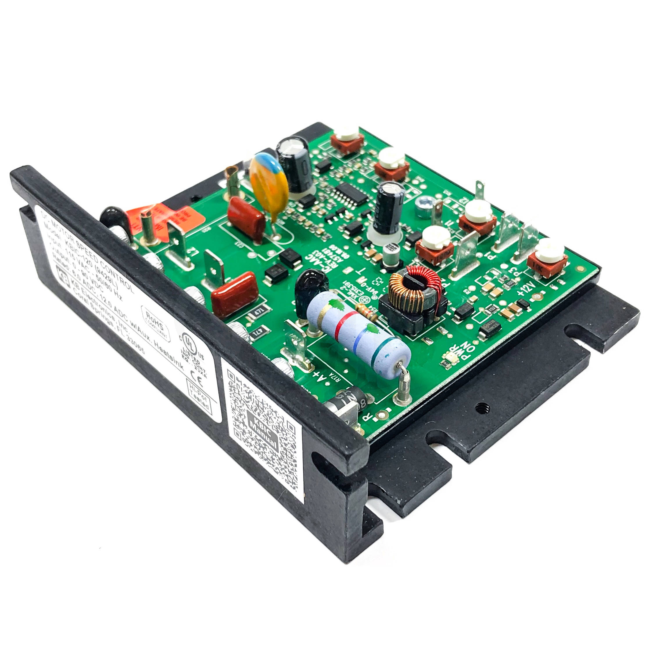 The KBIC? full-wave DC motor speed controls are designed for applications demanding excellent performance, high reliability and low cost. Although compact in size (only 4.30" x 3.64" x 1.25"), these controls offer better than 2% regulation over a 50:1 speed range. The controls are fabricated with components which have proven reliability, including MOV transient protection, which is used to protect the power bridge. Integrated circuitry is used to provide a non-complicated design with superior load and line voltage regulation. Electronic current limiting (CL) protects the motor and control against overloads by limiting the maximum level of output current. Acceleration start (adjustable from .5 to 4 seconds) provides a smooth start each time the AC power is applied.