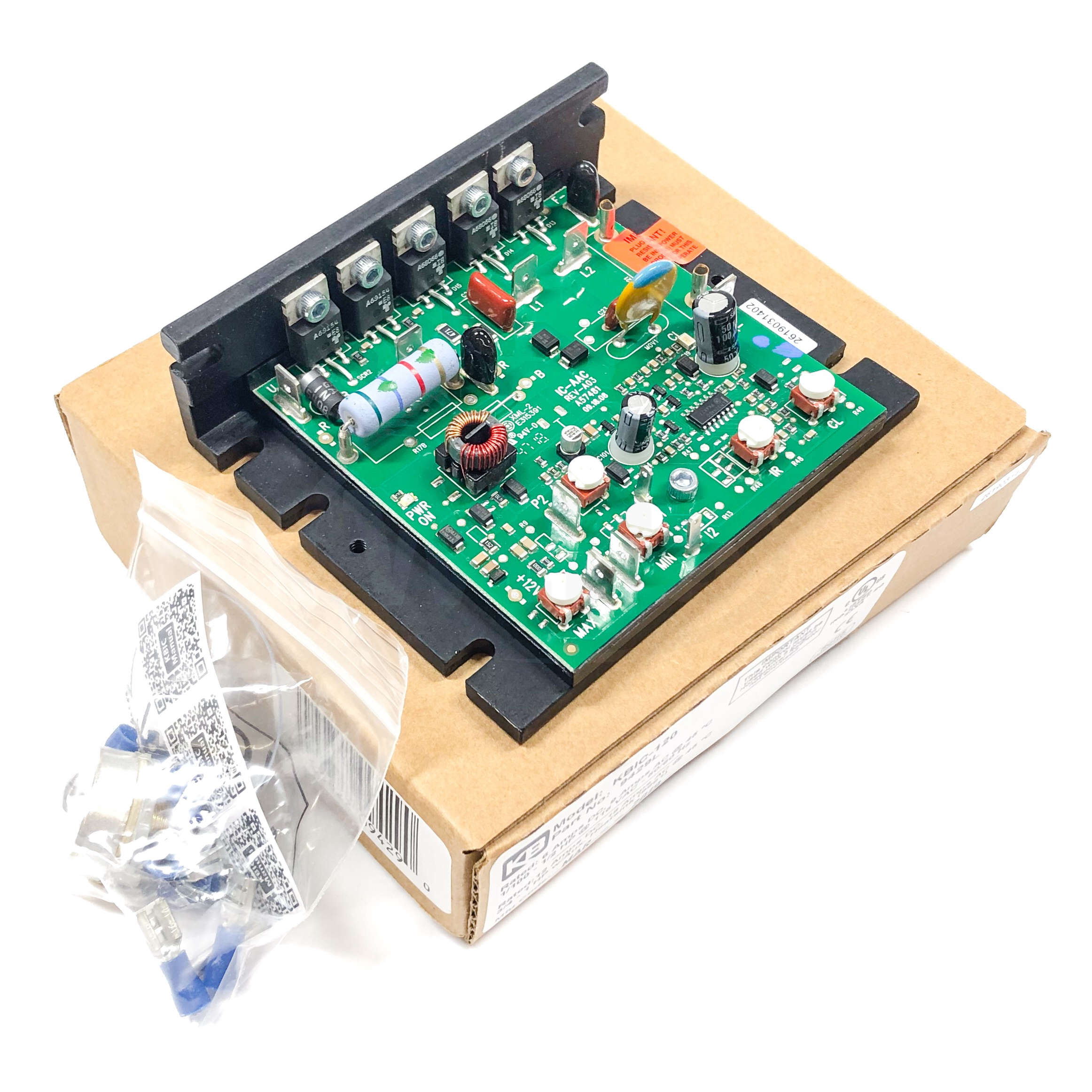 A unique feature of the KBIC? controls is the Plug-in Horsepower Resistor?. It eliminates the need for recalibrating IR Comp and Current Limit when the control is used on various horsepower motors. Additional versatility is achieved by using the Auxiliary Heatsink (optional) which is used to double the horsepower rating of each model. The output of the control is a linear function of potentiometer rotation. The KBIC? can also be operated in a voltage following mode by supplying an isolated analog signal (0 ? 9VDC) to the input terminals P2 (+) and F-. The controls are terminated as standard with Q-D terminals. A Barrier Terminal Accessory Kit is available which incorporates both line and armature fuses. The Inhibit? circuit (terminals I1 and I2) is provided to electronically disconnect the armature output voltage. Another standard feature is Auto Inhibit?. This circuit prevents false starts and high surge currents when cycling the KBIC? control with the AC line.