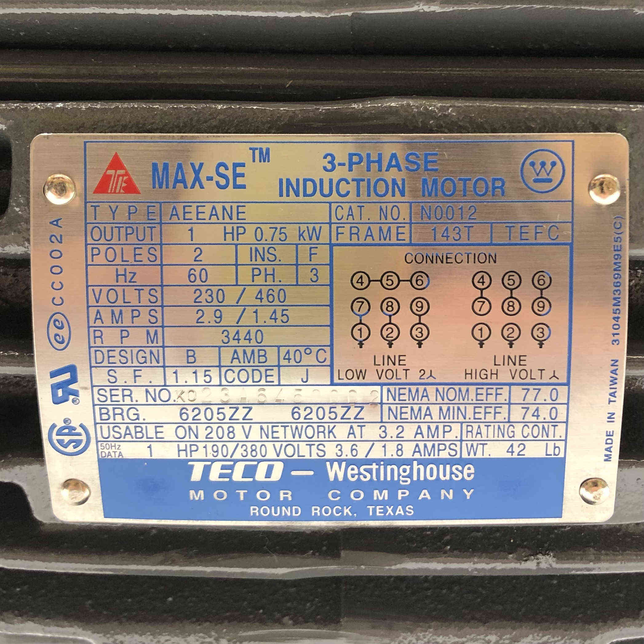 N0012 Teco-Wesinghouse 1Hp 0.75kw, 2Pole, 230/460V, 2.9/1.45AMP, 3440 RPM Motor