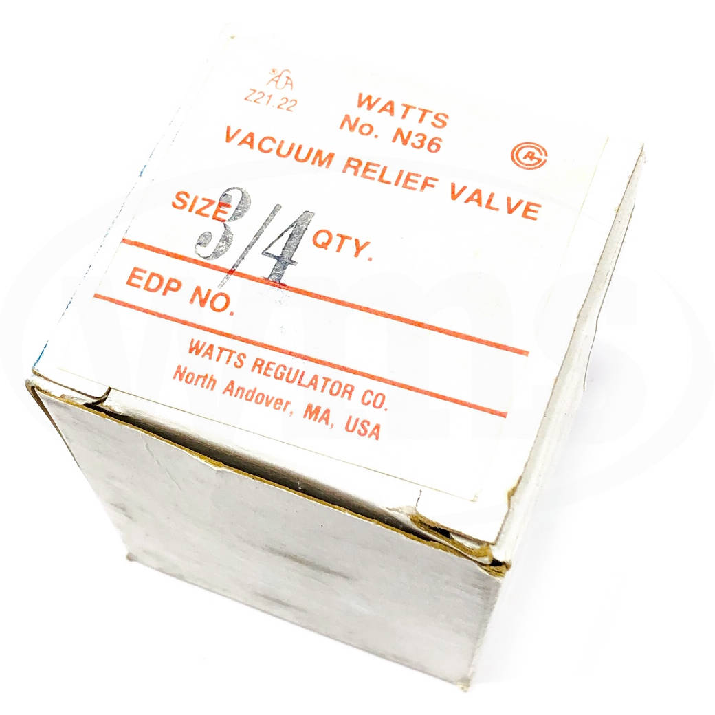 Series N36 Water Service Vacuum Relief Valves are used in water heater/tank applications to automatically allow air to enter into the piping system to prevent vacuum conditions that could siphon the water from the system and damage water heater/tank equipment. They have a brass body construction with NPT male inlet connection and a protective cap. Series N36 has a low profile design, is tested and rated to ANSI Z21.22, and is CSA certified. It is suitable for low pressure steam and water service, and is ideal for use in domestic water heaters and supply tanks, table top heaters, jacketed steam kettles, unit heaters, low pressure steam systems, and steam coil heaters. Maximum Working Pressure: 200psi (13.8 bar). Maximum Steam Pressure: 15psi (103 kPa).