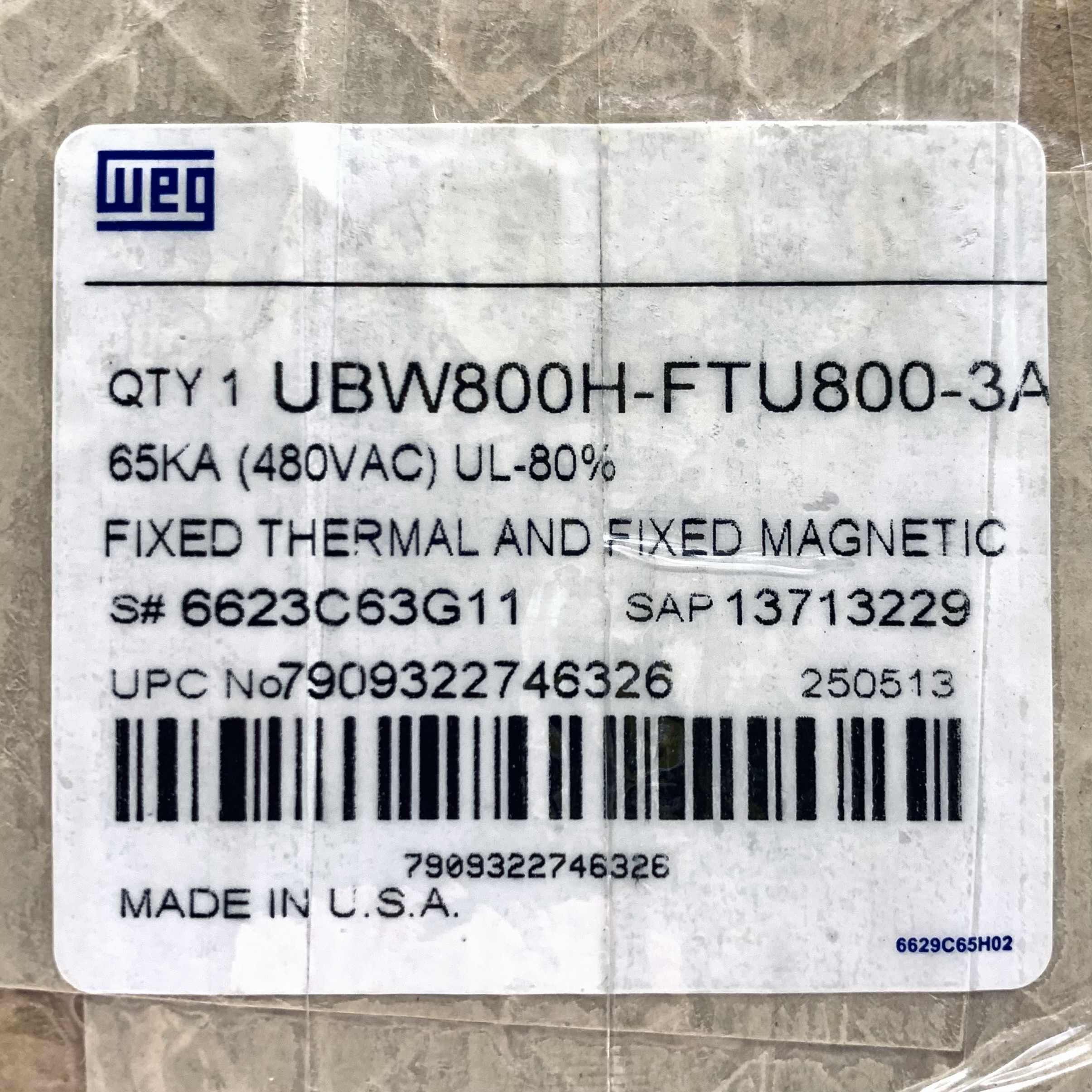 UBW800H-FTU800-3A WEG UBW Series 3-Pole, 800Amp Circuit Breaker