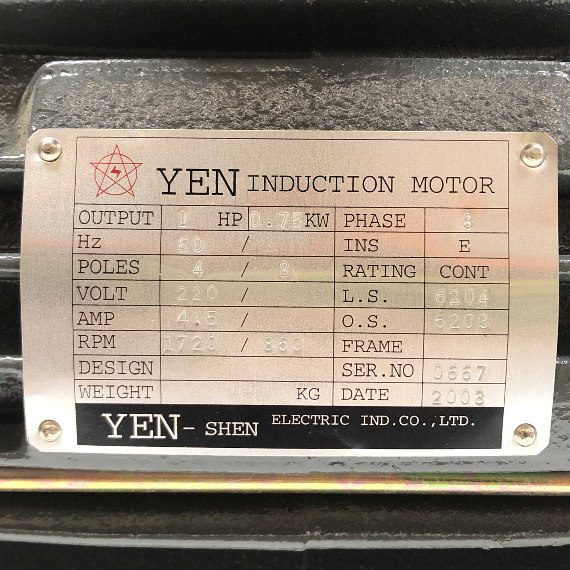 Yen Induction Motor 1Hp, 3Ph, 60Hz, 4/8 Pole, 220V, 4.5A, 1720/860Rpm