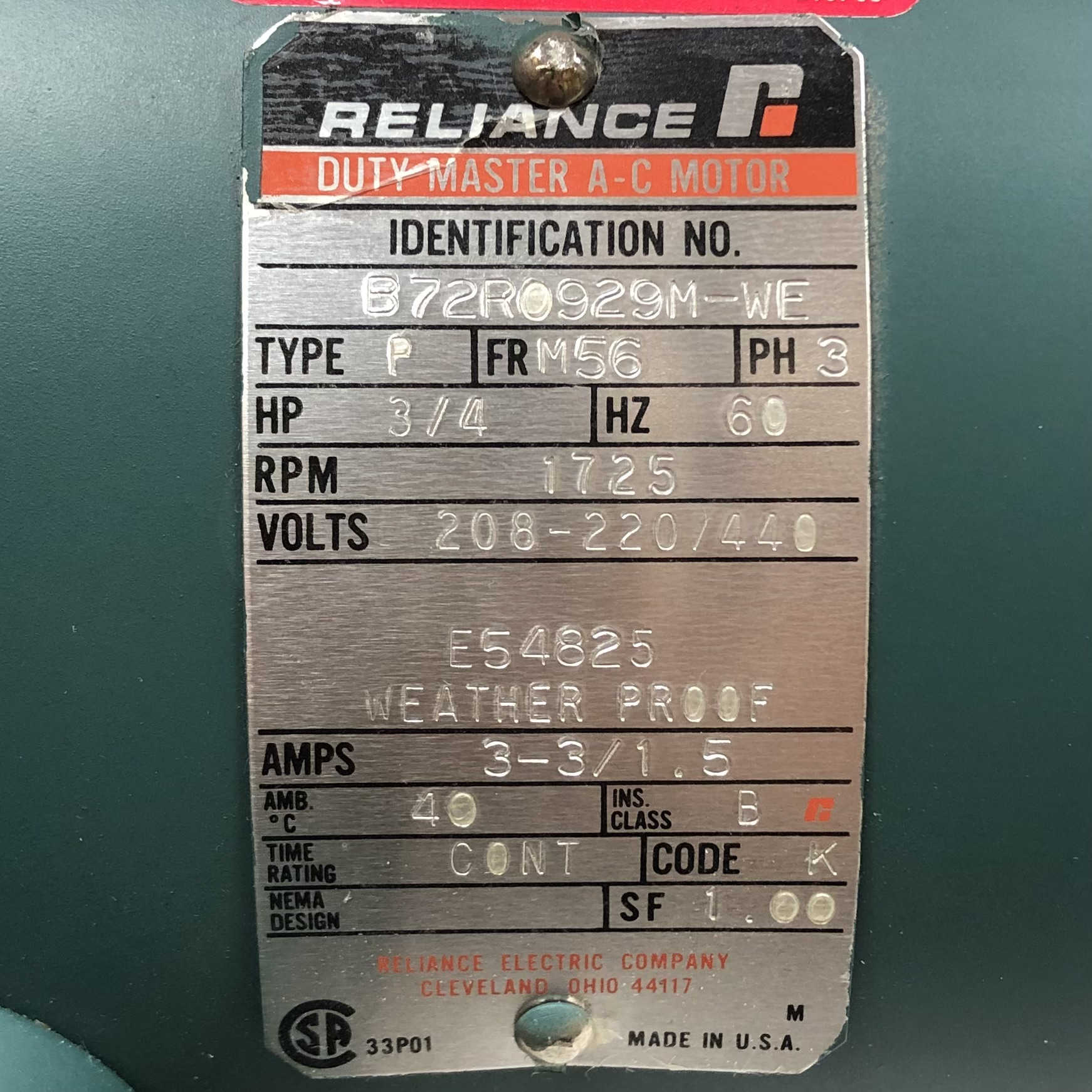 B72R0929M-0F Reliance Duty Master A-C Motor, Type P, FR M56, 3Ph, 3/4Hp, 60Hz, 1725 Rpm, 208-220/440V, E54825, Weather Proof, 3-3/1.5A