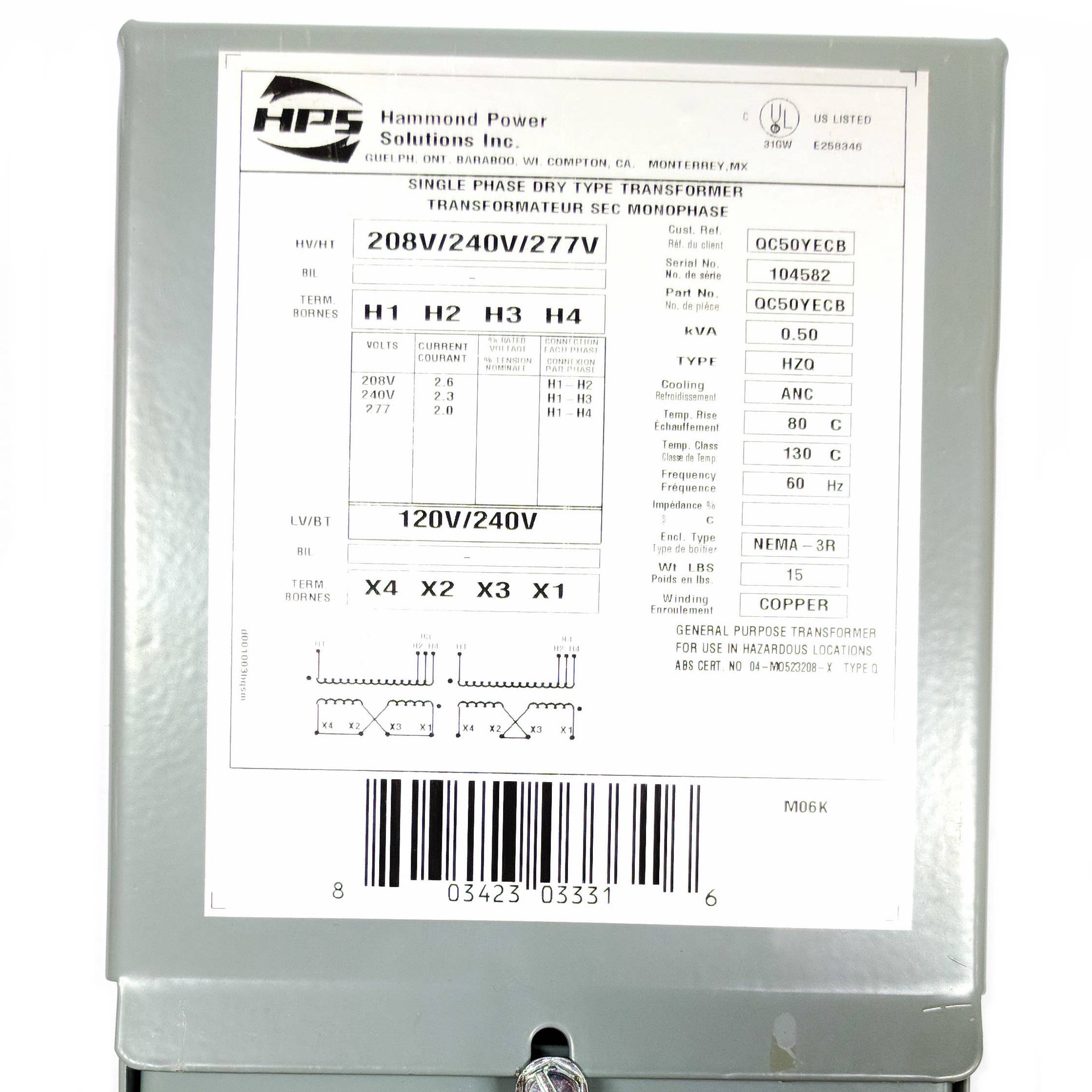 Hammond Power, QC50YECB, Encapsulated Dry Type Distribution Transformer, 0.5kVA, 1Ph, 208/240/277 Pri/120/240 Sec, Nema 3R Enclosure,