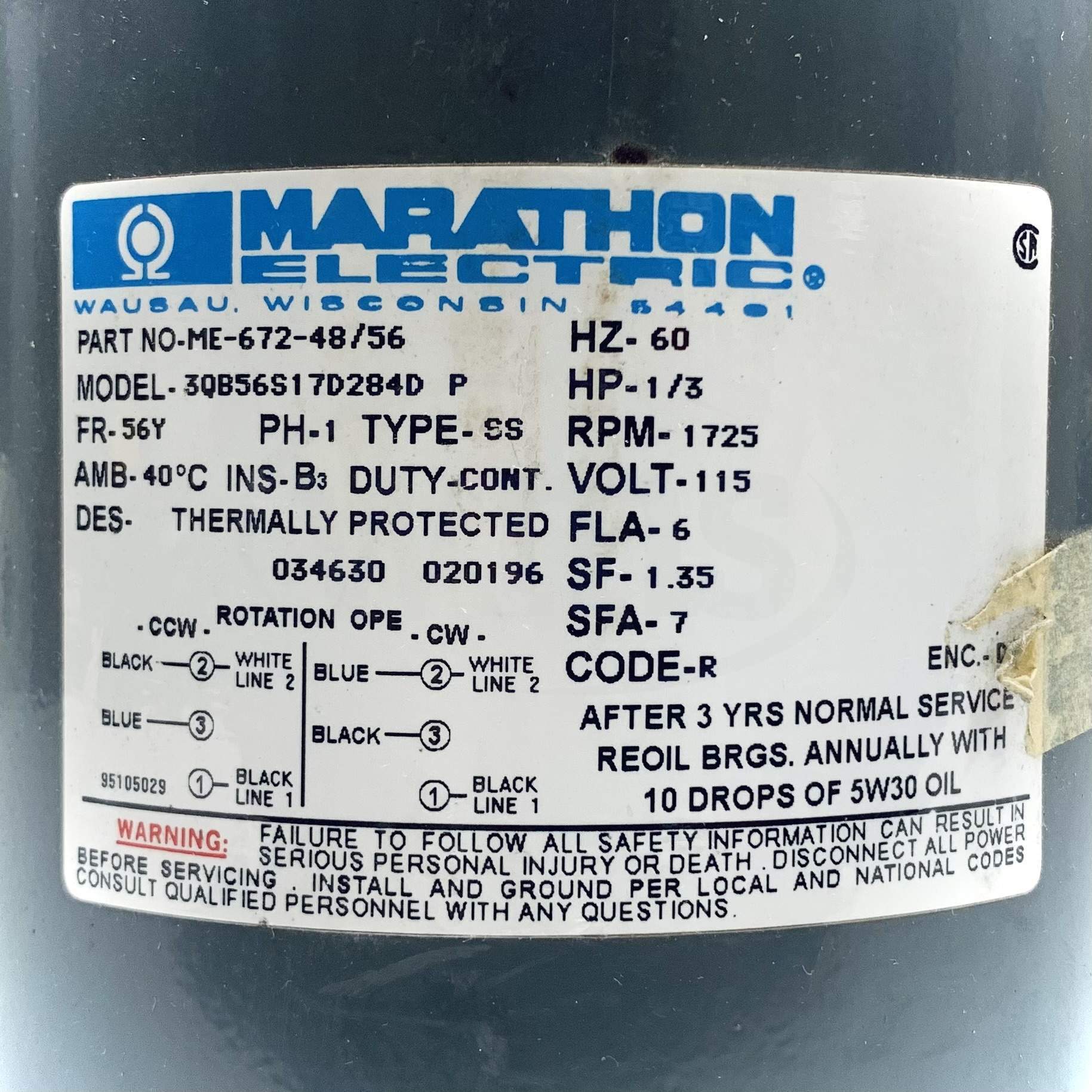 ME-672-48/56 Marathon 1/3 HP Blower Motor 1725 RPM, 115V, 56Y FR