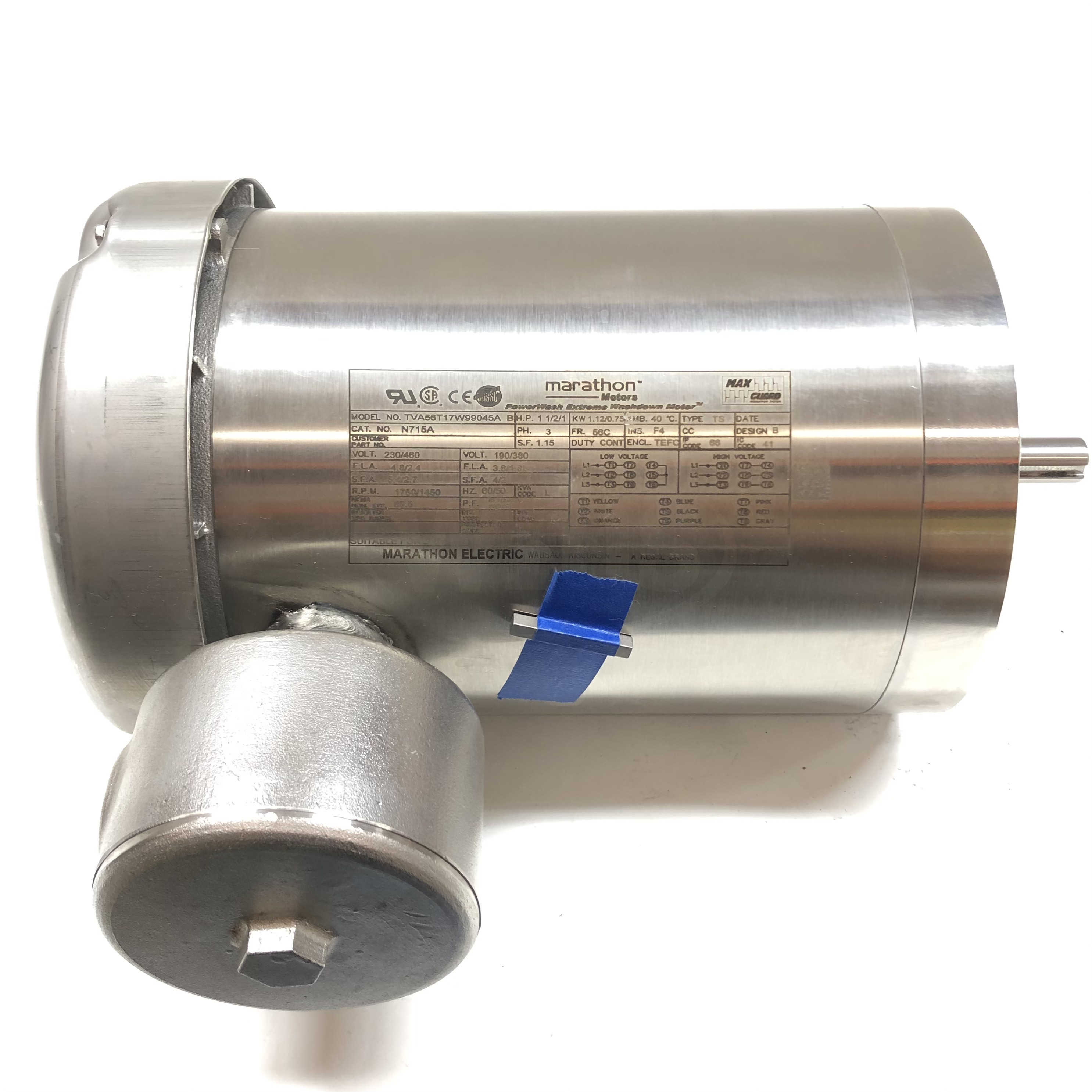 Marathon PowerWash™ Extreme Wash Down Duty™ General Purpose Motor, 1.50 HP, 3 Ph, 60 Hz, 230/460 V, 1800 RPM, 56C Frame, TEFC - N715A