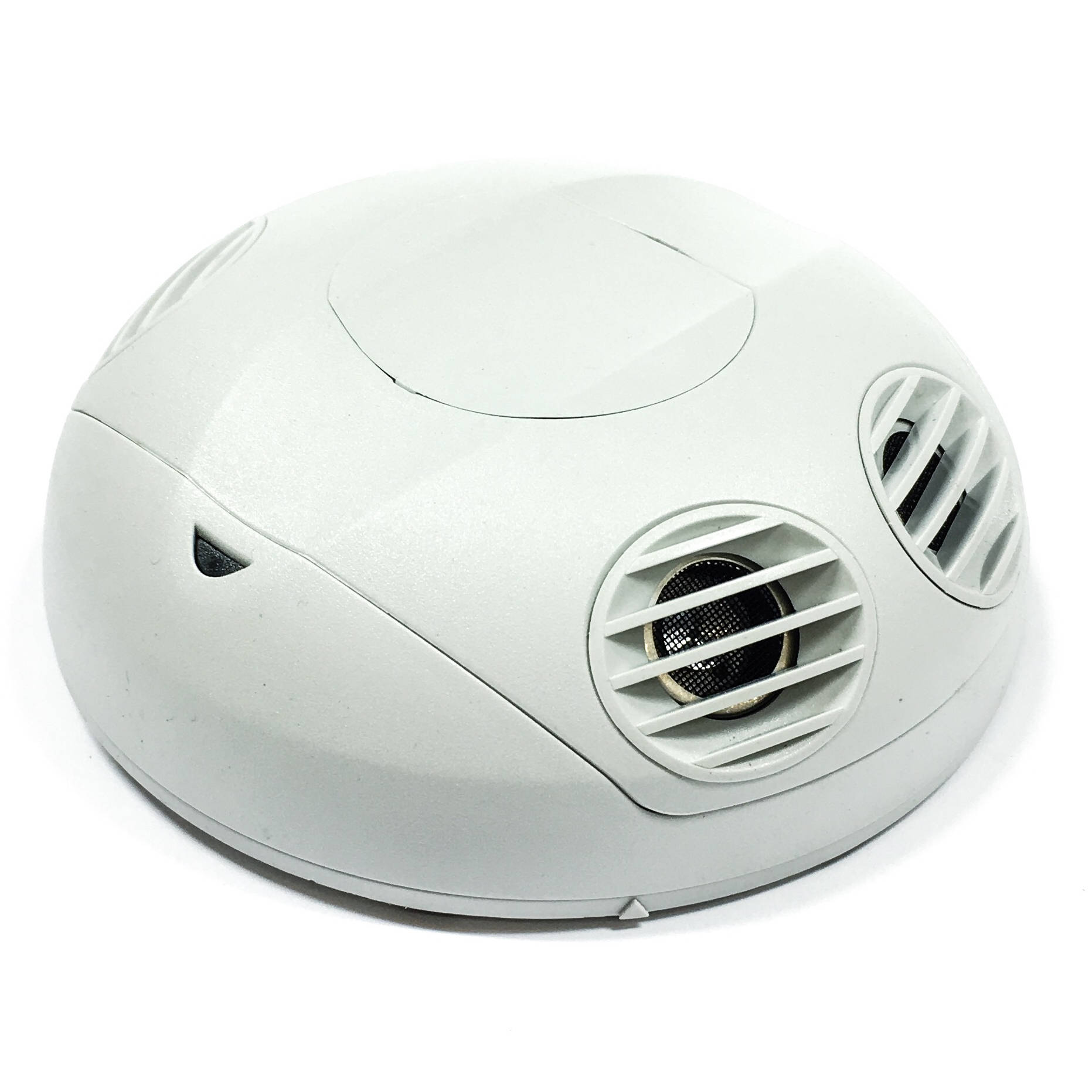 Occupancy Sensor, Ceiling Mounted, Ultrasonic only, 24VDC, 30mA power consumption, 2000 sq ft: 64'Lx32'W, minor motion: 45'Lx23'W), green LED, auto adapting, walk-through, time delay 30s-30m, test mode (6s time delay for 15m with auto exit), connect gray wire for photocell ambient light hold-off, 360 degree harmonic wheel (rotatable), mounting height 8'-10', PIR, cUL/NOM/ANCE listed, CEC Title 24 compliant. Color: off-white.